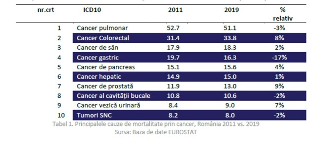 Cancerul pulmonar se menține drept primă cauză de deces prin cancer, cu o rată de mortalitate care a crescut cu aproape 11% comparativ cu anul 2000. Mortalitatea a crescut, deasemenea, pentru 6 tipuri de cancer, colorectal, cancer de sân, prostată, cancer hepatic, cancer al vezicii urinare și de pancreas. Incidența cancerului este marcată de inegalități sociale. Prevalența ridicată a factorilor de risc și investiția modestă în prevenție primară și secundară contribuie la povara bolii în România.