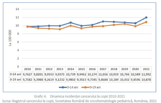În cazul copiilor, numărul mediu de cazuri noi luate in evidența retelei naționale este de 410 cazuri noi pean, pentru grupa de vârstă 0-19 ani, reprezentând o incidență medie brută de 9,82 la 100.000. Asta în timp ce sunt diagnosticate 324 cazuri noi pe an, pentru grupa de vârstă 0-14 ani, reprezentând o incidență medie brută de 10,5 la 100.000.