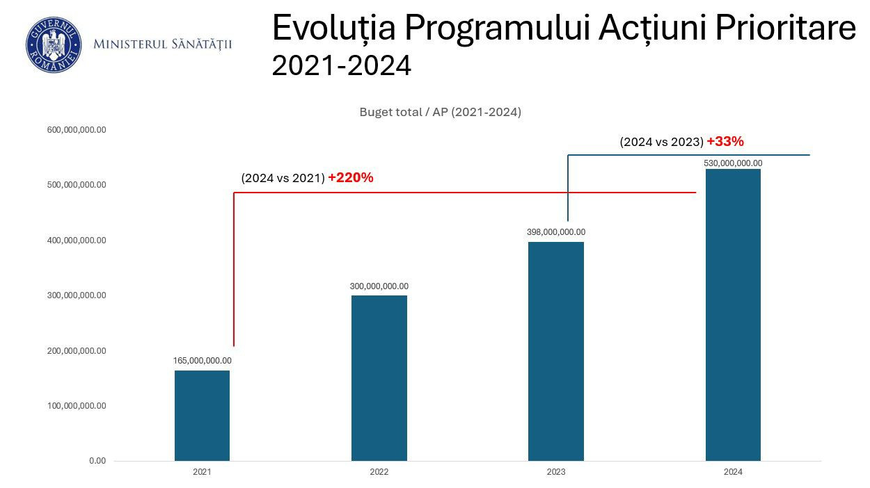 Față de alocarea inițială din ianuarie 2024, de 330 de milioane de lei, astăzi, Ministerul Sănătății a aprobat suplimentarea programului cu încă 200 de milioane de lei.