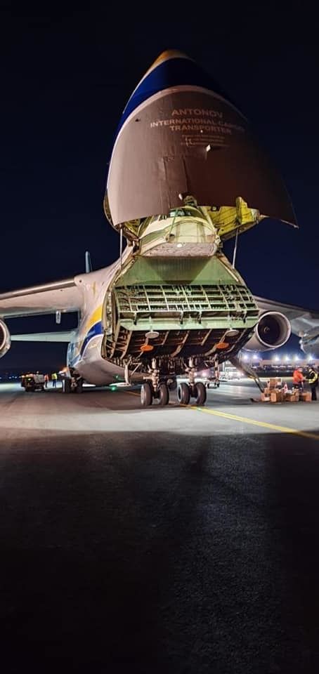 Antonov a adus în România: 200.000 de combinezoane, 200.000 de viziere, 923.000 de mănuși de latex. Descărcare transportului a fost o operațiune complexă desfășurată de angajații aeroportului împreună cu cei de la Unifarm.