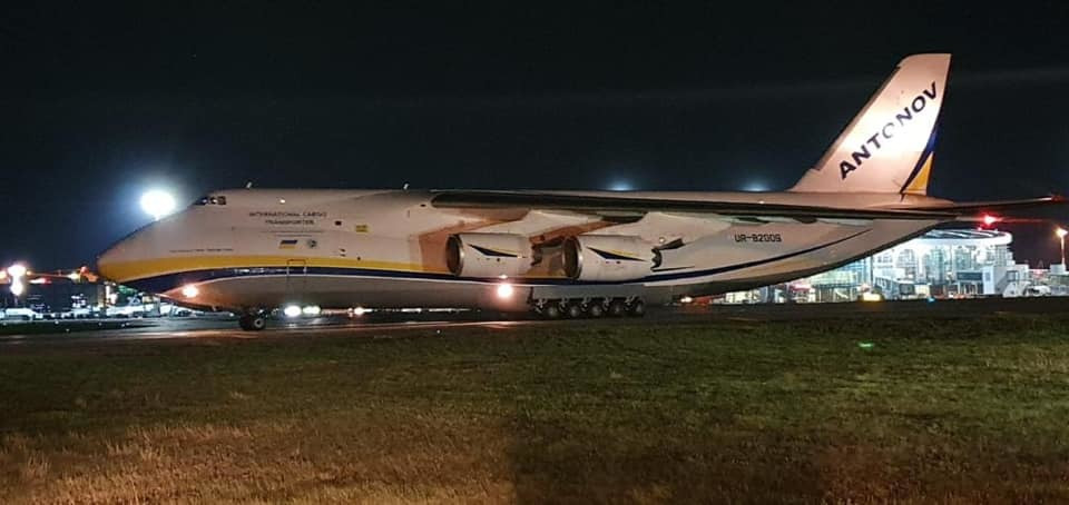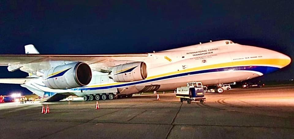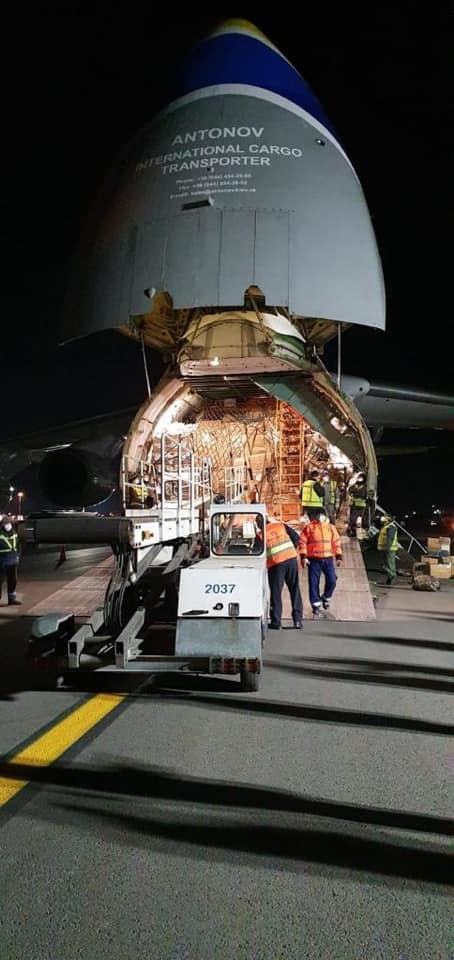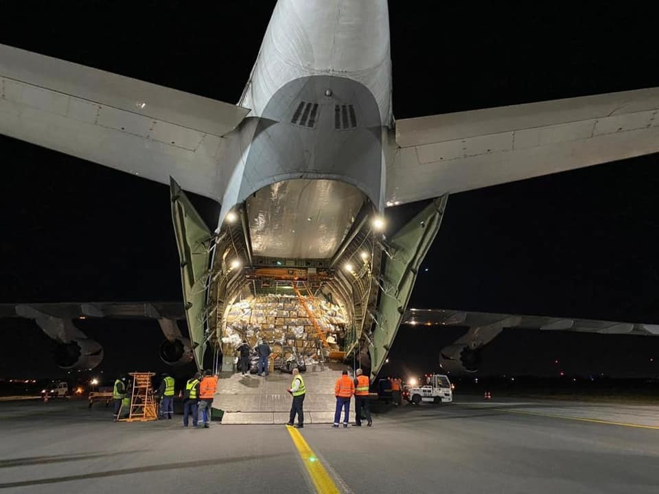 Antonov a adus în România: 200.000 de combinezoane, 200.000 de viziere, 923.000 de mănuși de latex. Descărcare transportului a fost o operațiune complexă desfășurată de angajații aeroportului împreună cu cei de la Unifarm.