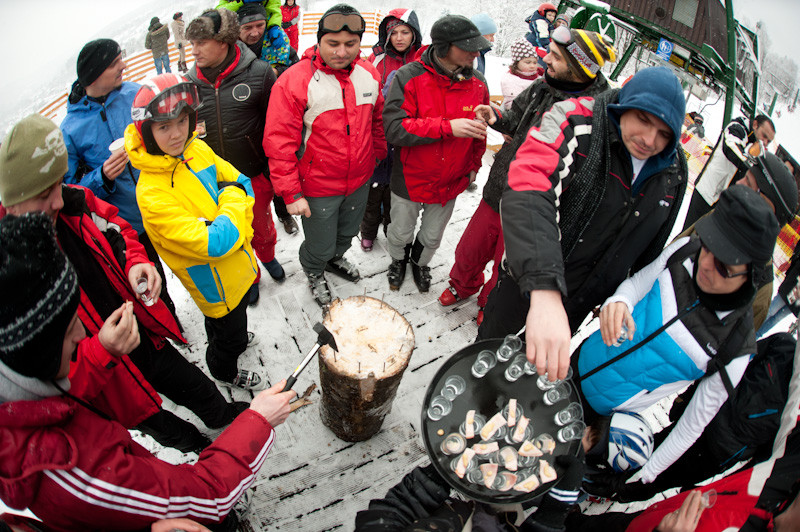 Concursul s-a derulat in jurul a trei busteni, iar din cei 37 de concurenti, 10 au intrat in finala. Un asemenea concurs, nu se putea desfasura fara “intariri”, asa ca turistii s-au inarmat cu rabdare si shoturi de palinca de casa, cu bacon si mustar.