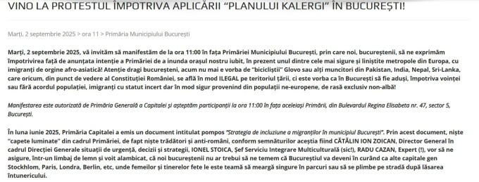 ”Marţi, 2 septembrie 2025, vă invităm să manifestăm de la ora 11:00 în faţa Primăriei Municipiului Bucureşti, prin care noi, bucureştenii, să ne exprimăm împotrivirea faţă de anunţata intenţie a Primăriei de a inunda oraşul nostru iubit, în prezent unul dintre cele mai sigure şi liniştite metropole din Europa, cu imigranţi de orgine afro-asiatică! Atenţie dragi bucureşteni, acum nu mai e vorba de “bicicliştii” Glovo sau alţi muncitori din Pakistan, India, Nepal, Sri-Lanka, care oricum, din punct de vedere al Constituţiei României, se află în mod ILEGAL pe teritoriul ţării, ci este vorba ca în Bucureşti să fie aduşi, împotriva voinţei sau fără acordul populaţiei, imigranţi cu statut incert dar în mod sigur provenind din populaţii ne-europene, de rasă exclusiv non-albă”, se arăta într-un anunţ al Noii Drepte.