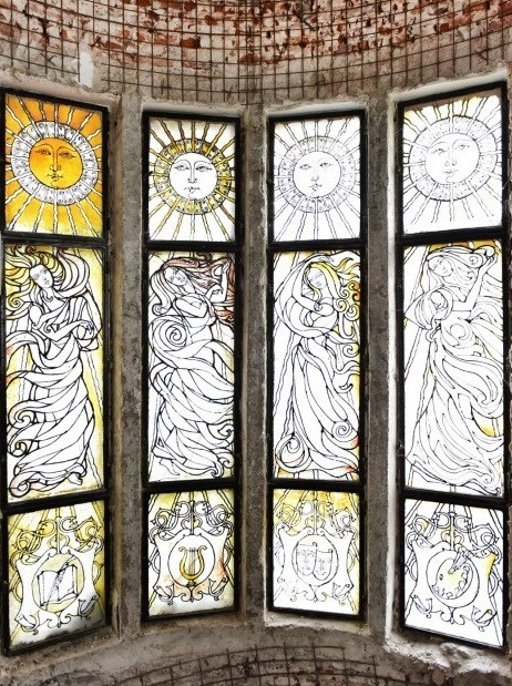 Vitraliul de dimensiuni generoase care înfăţişează patru dintre cele şapte arte, transpuse în personajele feminine redate într-o manieră Art Nouveau, sunt reprezentate deasupra simbolurilor pentru arta scrierii (cartea deschisă şi pana), arta muzicii (lira-reprezentare din Grecia antică), arta teatrului (cele două măşti-comedia şi tragedia) şi arta picturii (paleta). Soarele, regăsit în patru ipostaze în partea superioară a vitraliului, poate reprezenta un simbol masonic.
