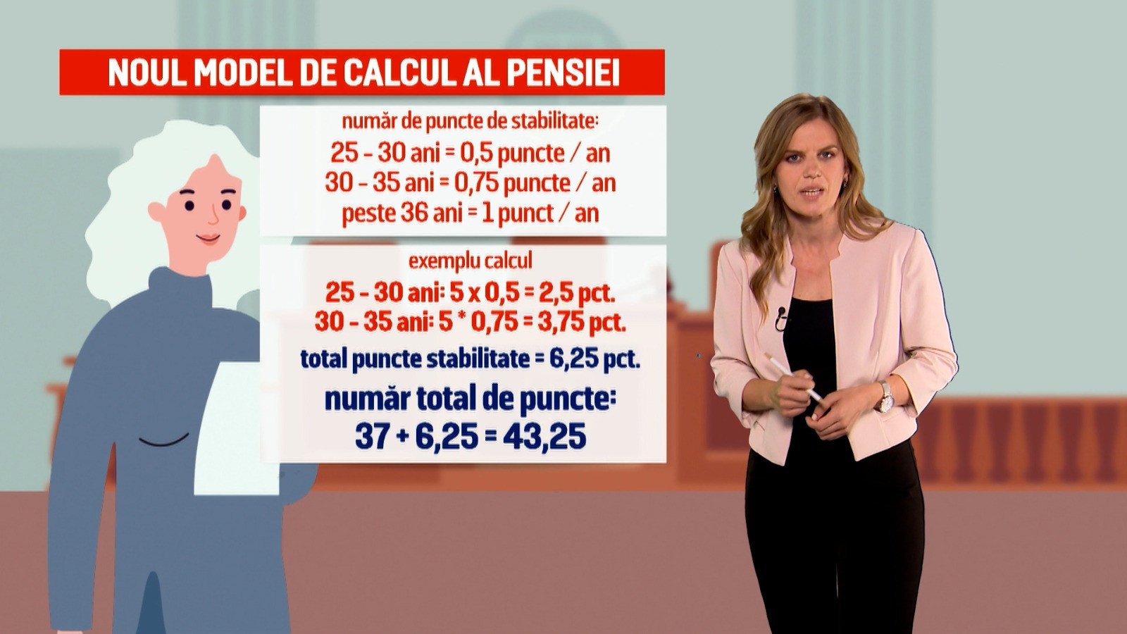 Să luăm exemplu unei doamne consilier juridic, cu un stagiu contributiv de 35 de ani și o pensie în plată de 2.500 de lei. Doamna are un total de 37 de puncte de contributivitate - acest număr apare pe fiecare decizie de pensionare de la Casa de Pensii. Cum pensionara a depășit stagiul contributiv de 25 de ani, primește pentru restul de 10 ani - 6,25 de puncte de stabilitate. Acestea se adună cu punctele de contributivitate și se obține un total de 43,25 de puncta.