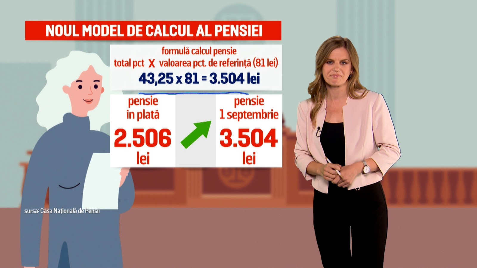 Așa cum arată formula stabilită în noua lege - pensia se calculează prin înmulțirea punctului de referință, adică 81 de lei, cu numărul total de puncte. Pensia ajunge astfel la 3.504 lei brut, de la 1 septembrie.