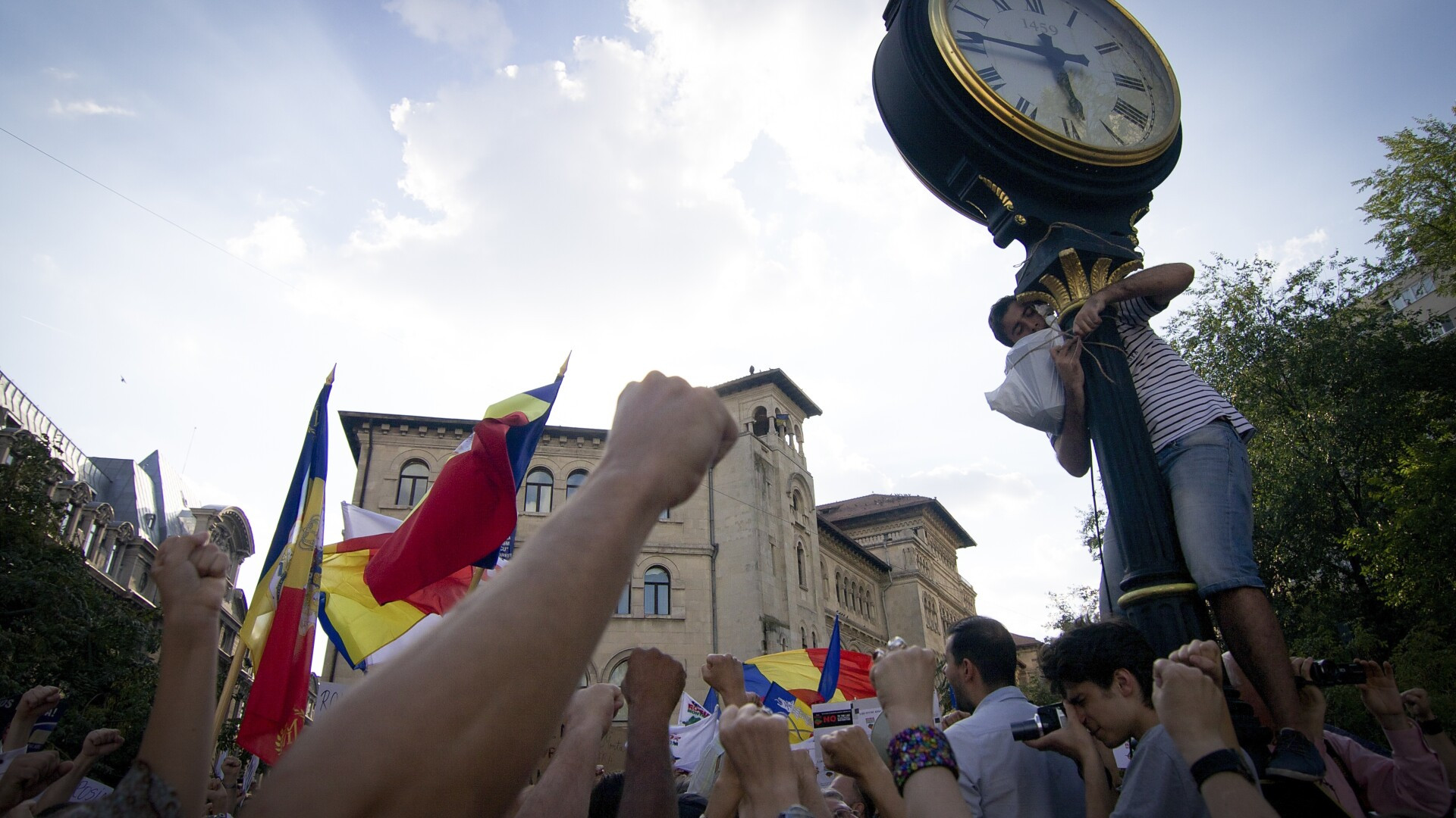 ora 20.00 Cativa manifestanti care se aflau in Piata Universitatii - unde protestau fata de adoptarea proiectului de lege privind exploatarea aurului de la Rosia Montana - au rupt cordonul de ordine impus de jandarmi..