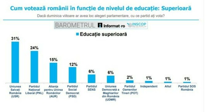 31% dintre votanţii cu educaţie superioară îşi exprimă preferinţa pentru USR. 24% dintre aceştia şi-ar exprima votul pentru PNL, 15% pentru AUR, 12% pentru PSD, 6% pentru SENS, 6% pentru UDMR, în timp ce 2% pentru POT. 1% susţin un candidat independent, 1% un alt partid, iar 1% SOS România.