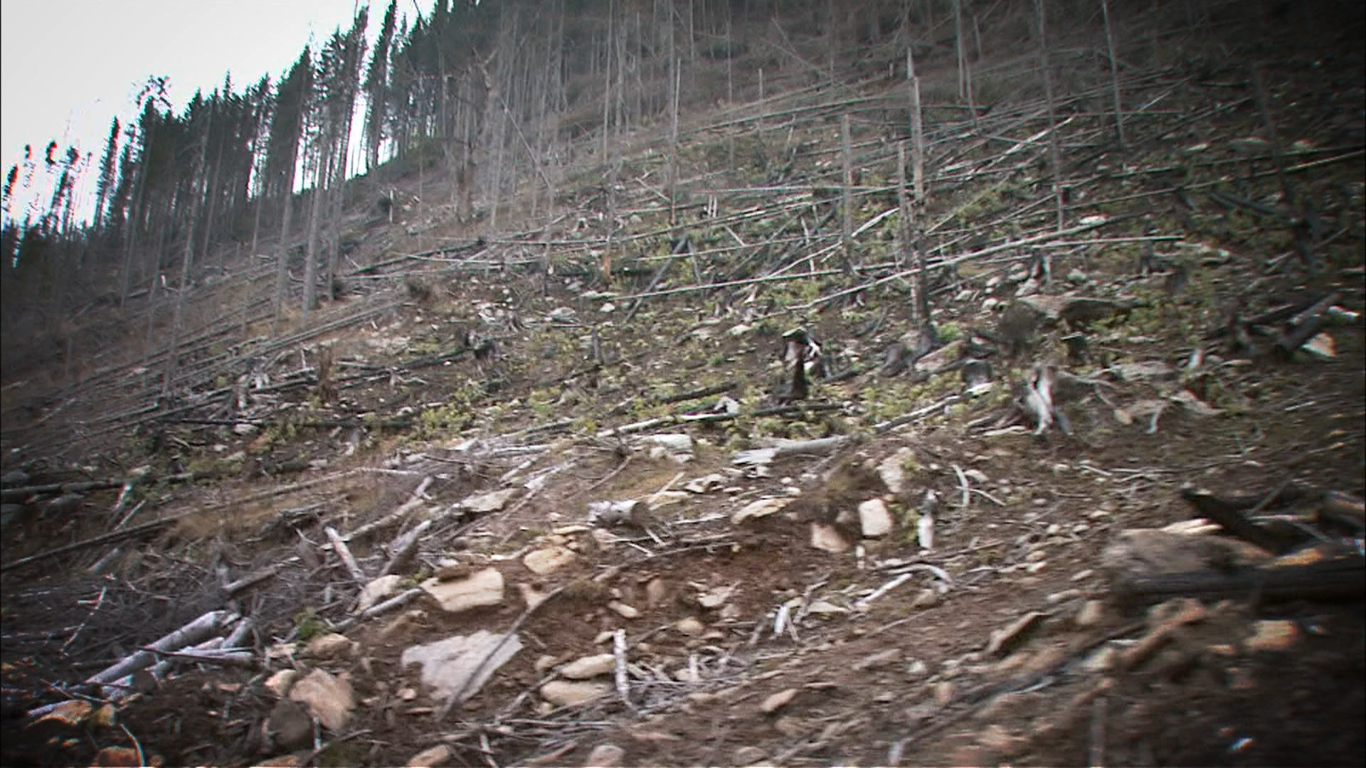 In zona Vaii Oltului, versanti intregi au fost complet defrisati. Firmele din zona au taiat cu acte - mai precis, cu acordul ocolului privat Valea Oltului - un ocol fantoma cu sediul pe Valea Oltului. De pe cele 915 hectare rase au coborat in ultimii ani peste 6.000 de tiruri cu lemn ilegal, pe un drum facut cu bani europeni, si nimeni nu s-a sesizat. Iar acum la priimi viitura versantii o vor lua la vale.