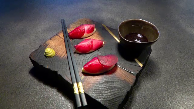 Radu Ionescu - head-chef fondator Kaiamo: ''Aici avem un sos de ciuperci fermentate în casa de noi, un ou moale, o grăsime de mangaliţa făcută pudră şi se pune deasupra preparatului''