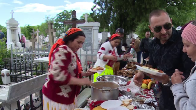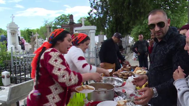 La masa lor bogată lumea s-a aşezat la coadă. Tradiţia spune că de Pastele Blajinilor se curăţa mormintele de buruieni, se plantează flori şi se împart ouă vopsite.