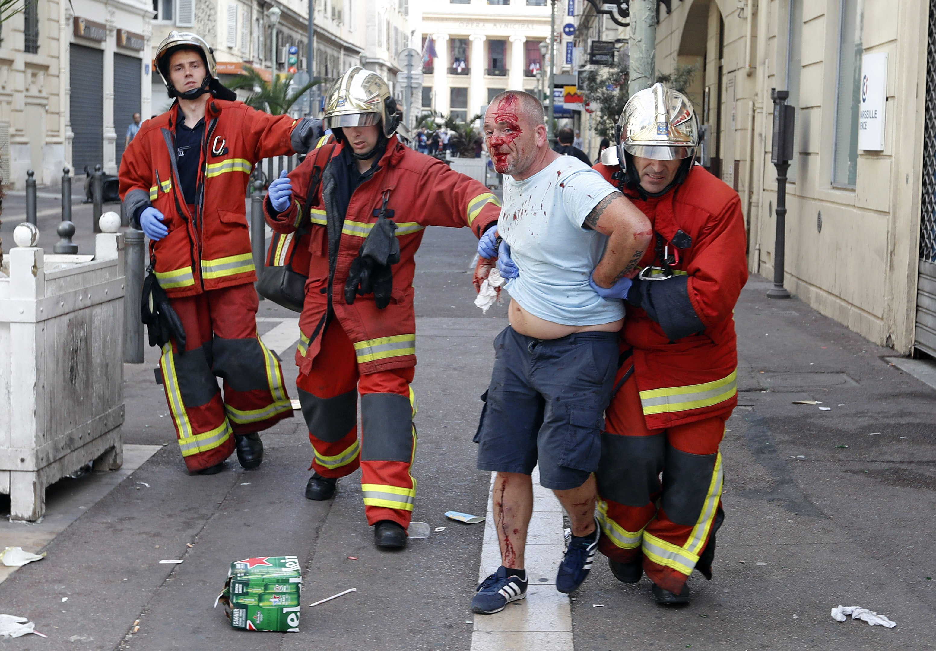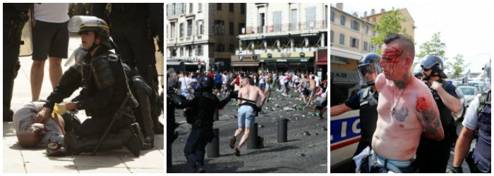 Inainte de meci, fanii rusi si englezi s-au cautat si pana la urma s-au gasit pe strazile inguste si in pietele Marsiliei. In loc sa-si sustina pasnic echipele, au distrus terasele si s-au batut cu tot ce le-a cazut in mana...scaune, sticle, chiar si o carja. Cele mai grave violente au fost in zona Portului Vechi.In disperare de cauza politia franceza a intervenit cu gaze lacrimogene si cu un tun de apa. In haosul creat un suporter a luat loc pe scaun si s-a asezat comod sa urmareasca bataile de strada. Un altul a desfacut un steag rusesc si si-a facut o poza.