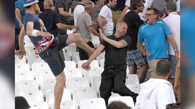 Suporterii rusi i-au atacat pe fanii englezi, sambata seara, in incinta stadionului Velodrome din Marsilia, la finalul meciului Anglia - Rusia, scor 1-1, din grupa B a Campionatului European, relateaza Reuters.