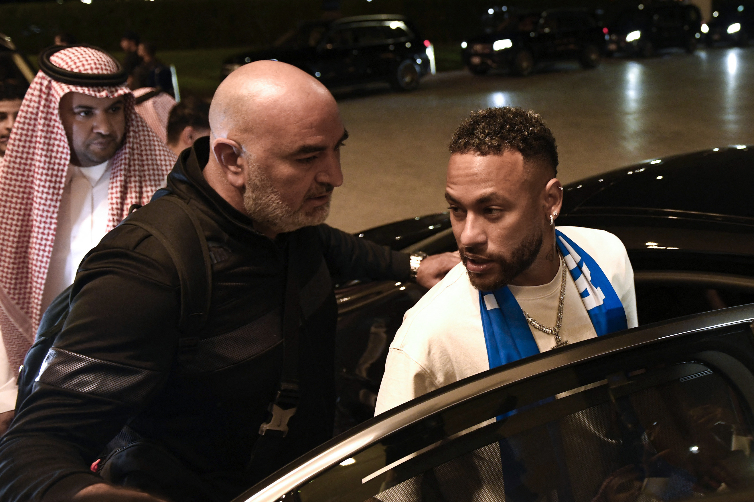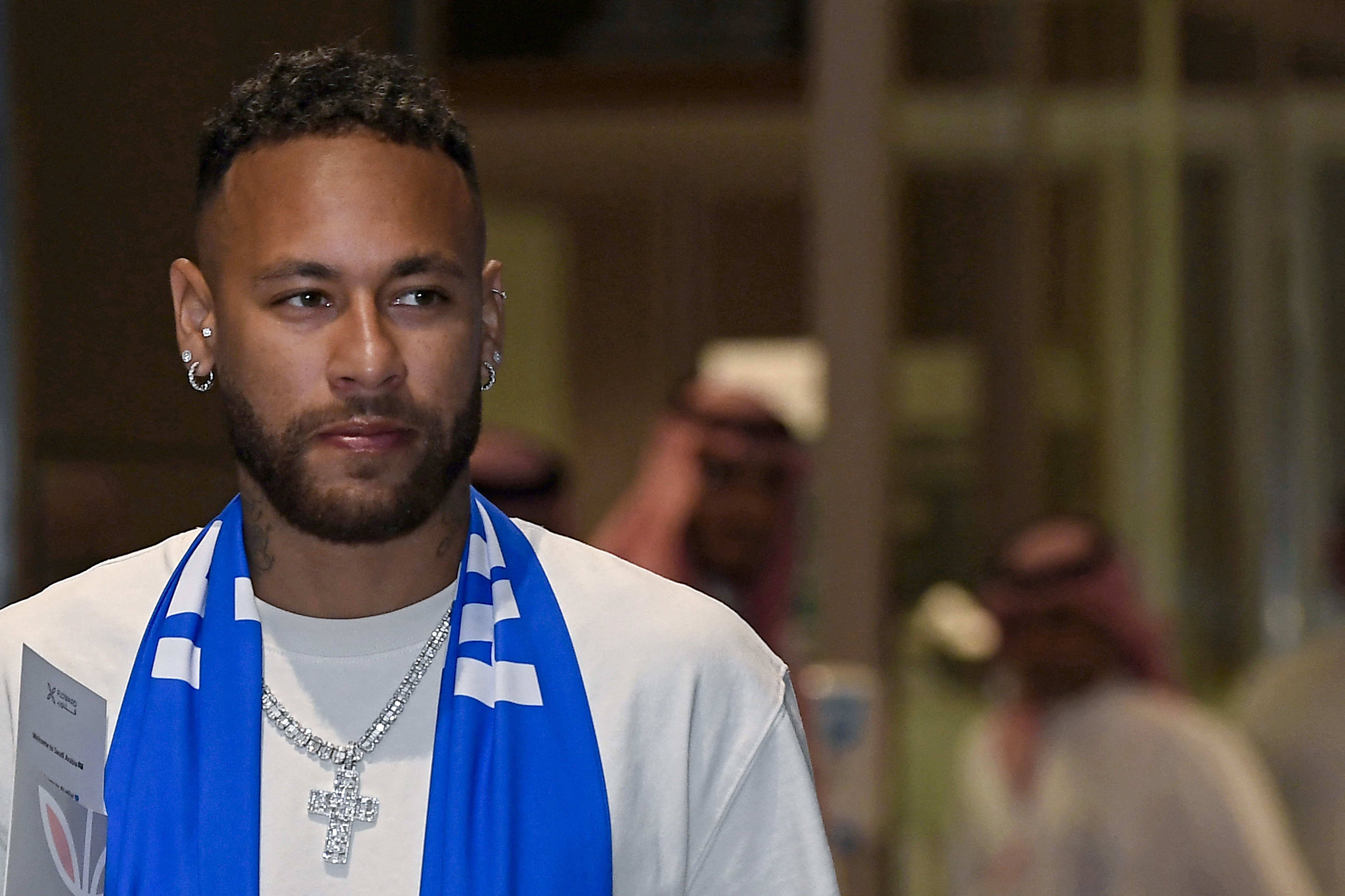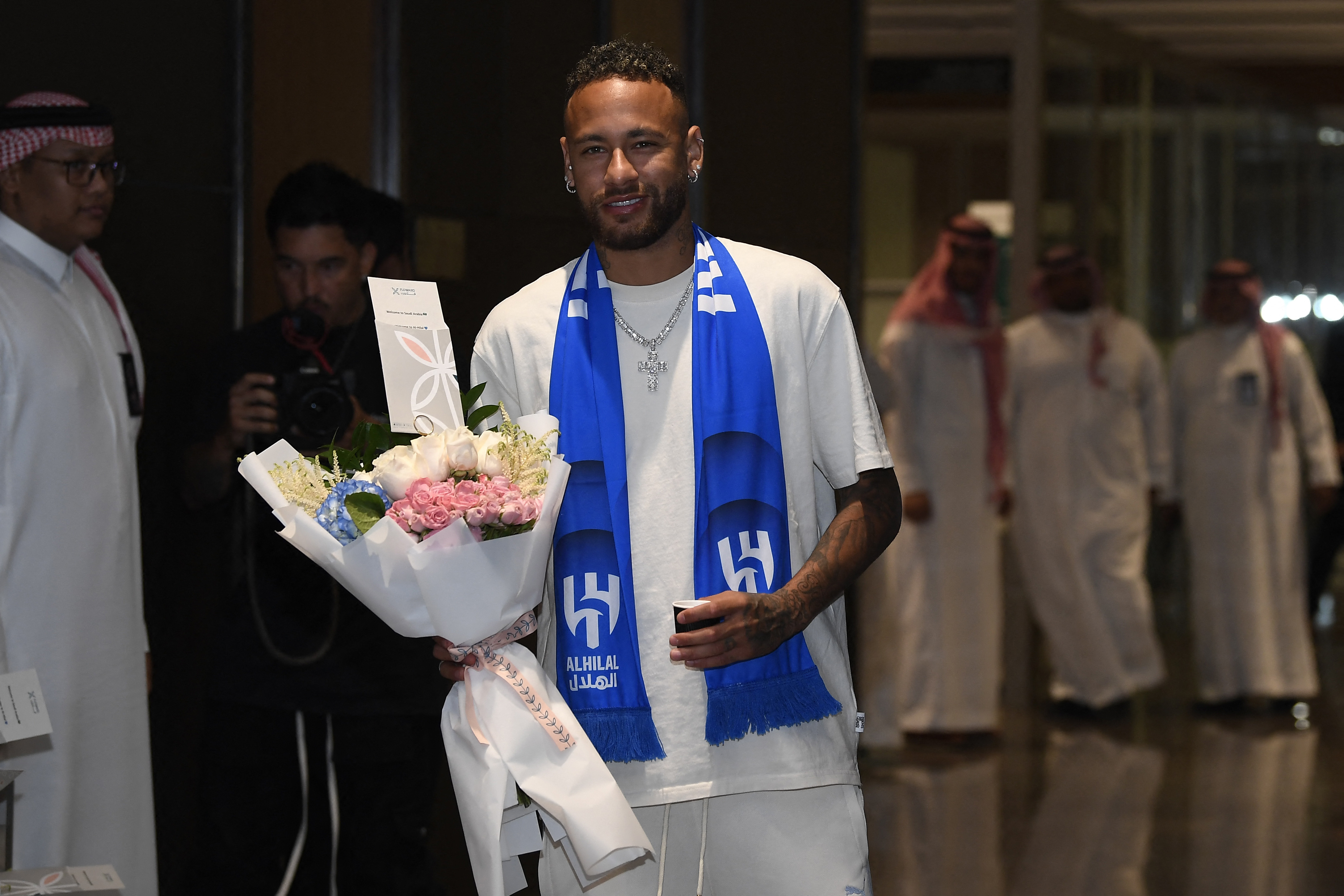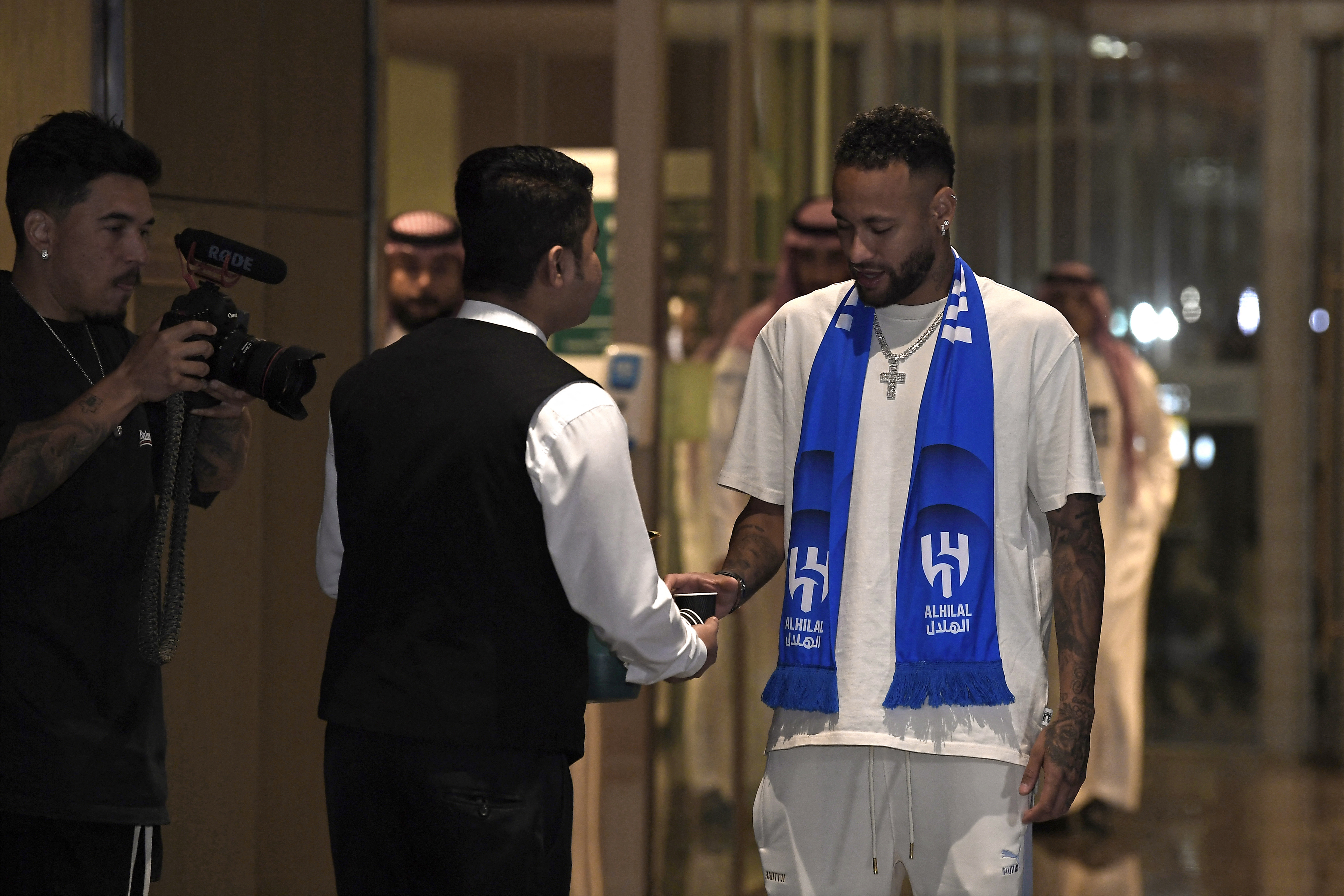 Întâmpinat la un salon al aeroportului din Riad, în prezenţa unui important dispozitiv de securitate şi în faţa a numeroşi reprezentanţi ai presei şi ai clubului, Neymar a participat la o şedinţă foto.