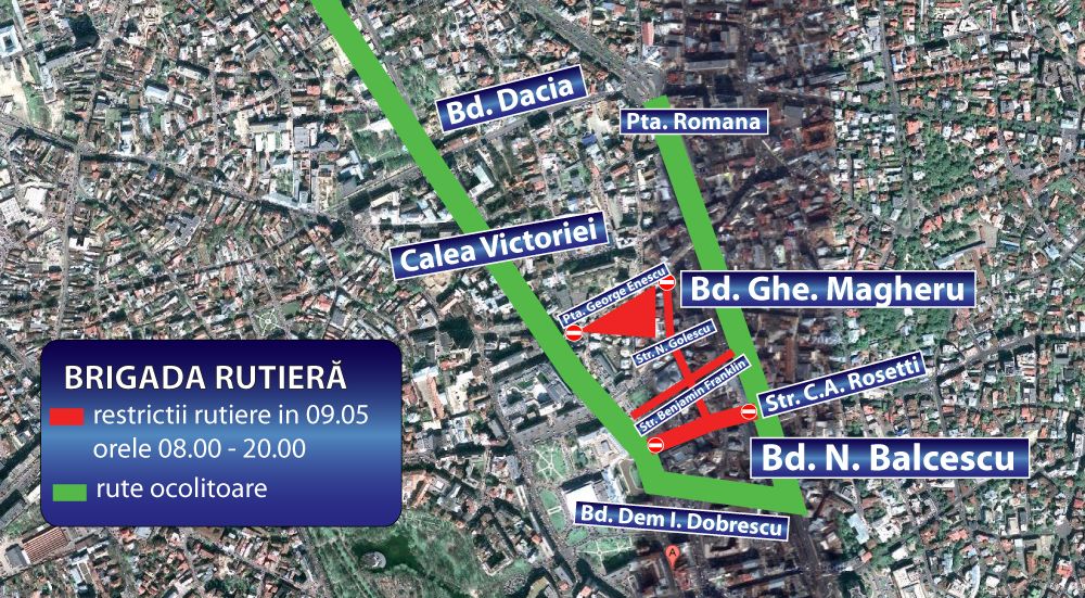Soferii vor putea circula pe ruta ocolitoare Calea Victoriei - strada Dem I. Dobrescu - Bulevardul N. Balcescu si Bulevardul N. Balcescu - Bulevardul Gheorghe Magheru - Piata Romana.