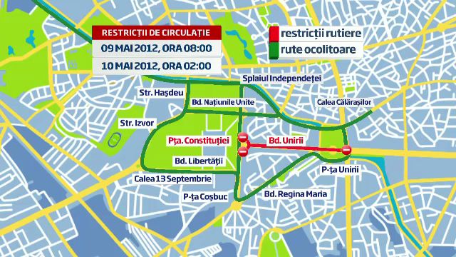 Pentru zona amenajata in Piata Constitutiei, deschisa in perioada 9 mai, ora 8.00 - 10 mai, ora 2.00, traficul va fi restrictionat pe Bulevardul Unirii, intre bulevardele I.C. Bratianu si Libertatii, precum si pe bretelele din Piata Constitutiei catre Bulevardul Unirii.