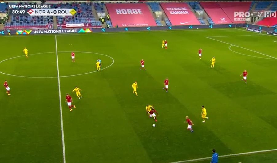 Minutul 74: Haaland devine eroul meciului, înscriind a treia oară în poarta României. Jucătorul norvegian a depășit fără probleme trei jucători din echipa României și l-a învins din nou pe Tătărușanu.