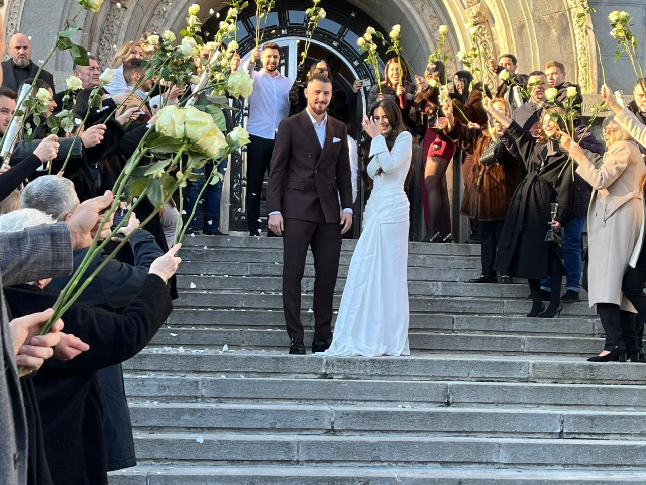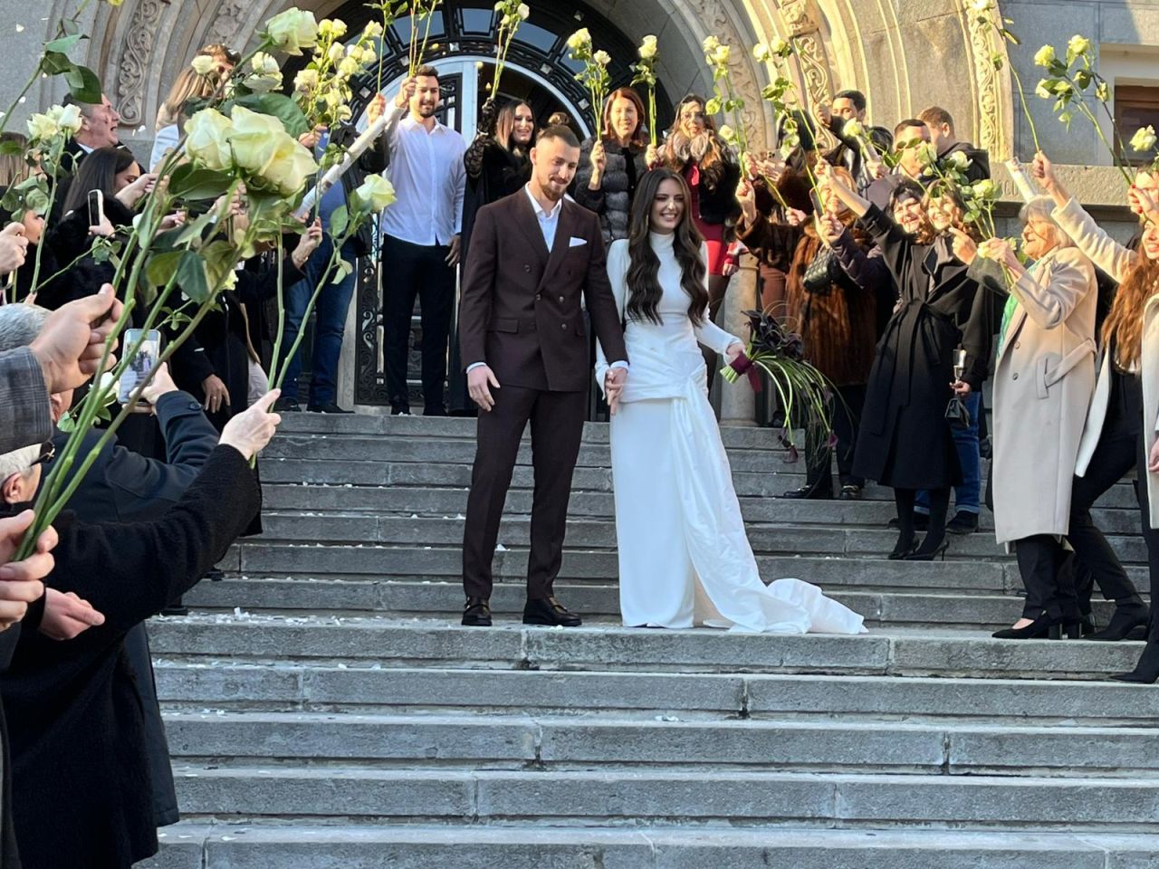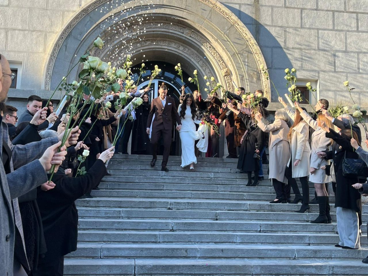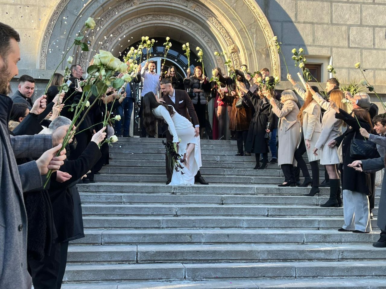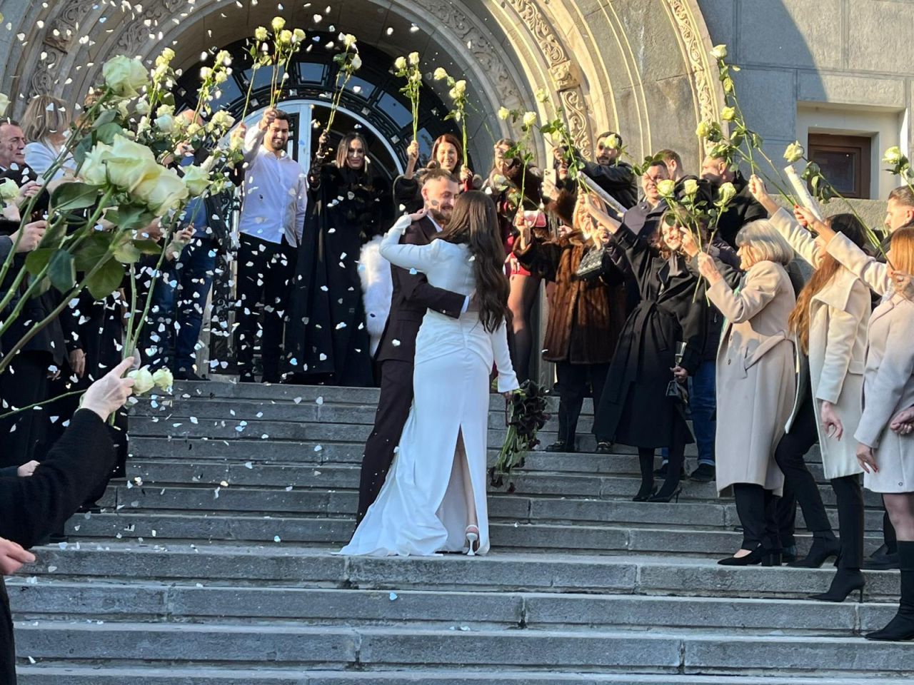 La finalul ceremoniei, cei doi au coborât treptele Primăriei sub aplauzele invitaților, care au aruncat boabe de orez, iar internaționalul român și-a sărutat soția pe treptele instituției.