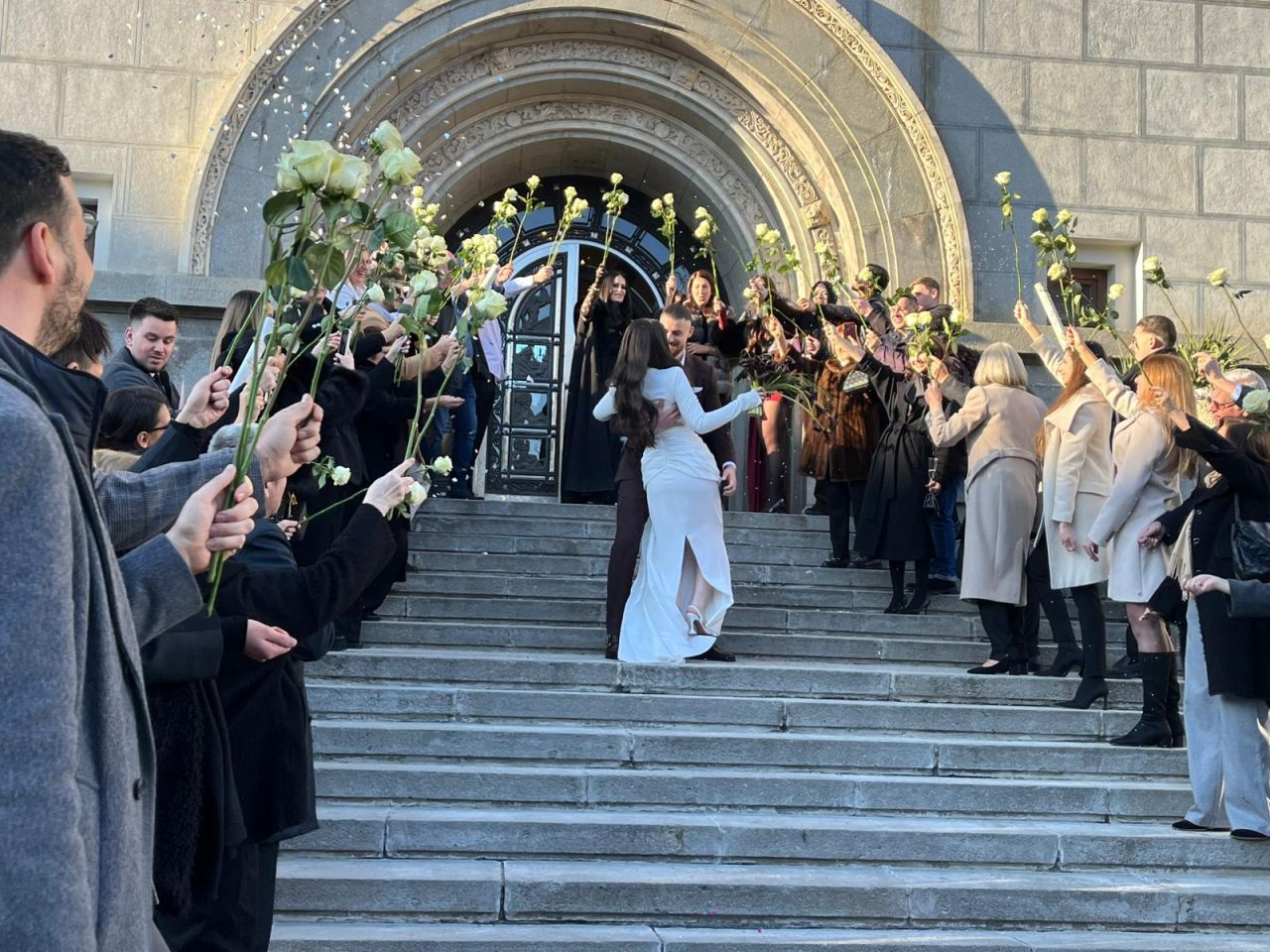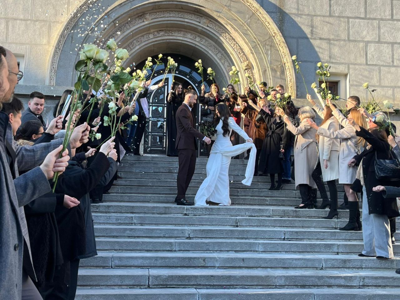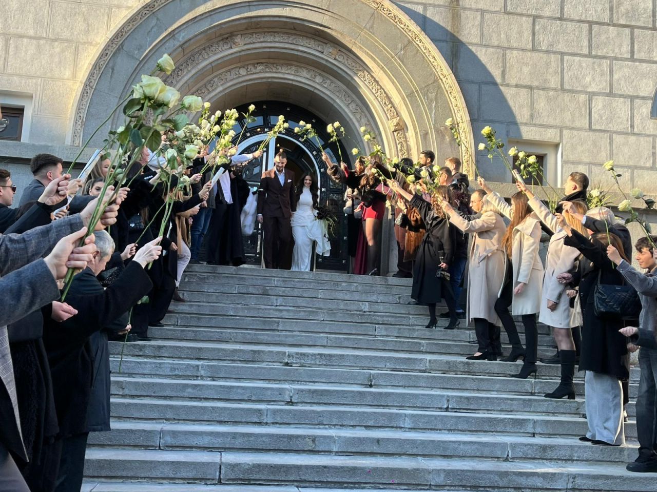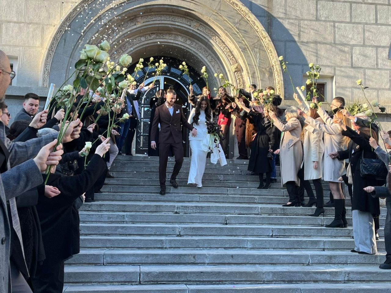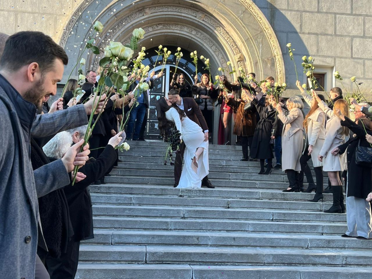 La finalul ceremoniei, cei doi au coborât treptele Primăriei sub aplauzele invitaților, care au aruncat boabe de orez, iar internaționalul român și-a sărutat soția pe treptele instituției.