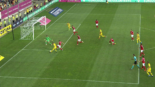 Minutul 47: GOL ROMÂNIA! Pușcaș deschide scorul după un corner perfect executat de Ianis Hagi.