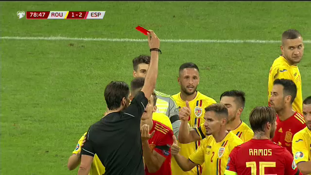 Minutul 80: Eliminare! Diego Llorente vede cartonașu roșu, după un fault la Pușcaș. Arbitrul refuză să dea penalty și dictează lovitură liberă de la marginea careului, pentru România.