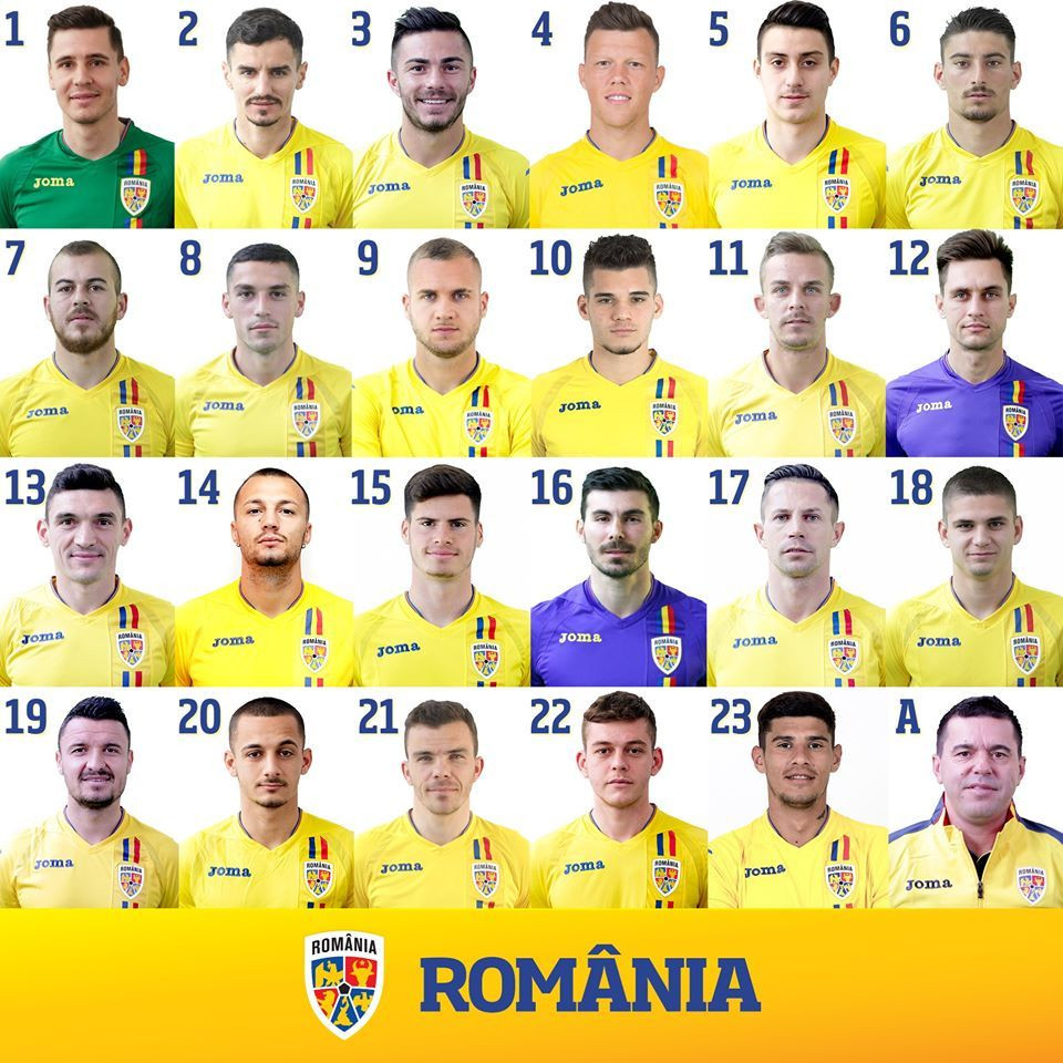 1. Silviu Lung • 2. Romario Benzar • 3. Alin Toşca • 4. Adrian Rus • 5. Ionuţ Nedelcearu • 6. Iulian Cristea • 7. Denis Alibec • 8. Nicolae Stanciu • 9. George Puşcaş • 10. Ianis Hagi • 11. Nicuşor Bancu • 12. Ciprian Tătăruşanu • 13. Claudiu Keşeru • 14. Vasile Mogoş • 15. Tudor Băluţă • 16. Florin Niţă • 17. Ciprian Deac • 18. Răzvan Marin • 19. Constantin Budescu • 20. Alexandru Mitriţă • 21. Dan Nistor • 22. Alexandru Cicâldău • 23. Florinel Coman.