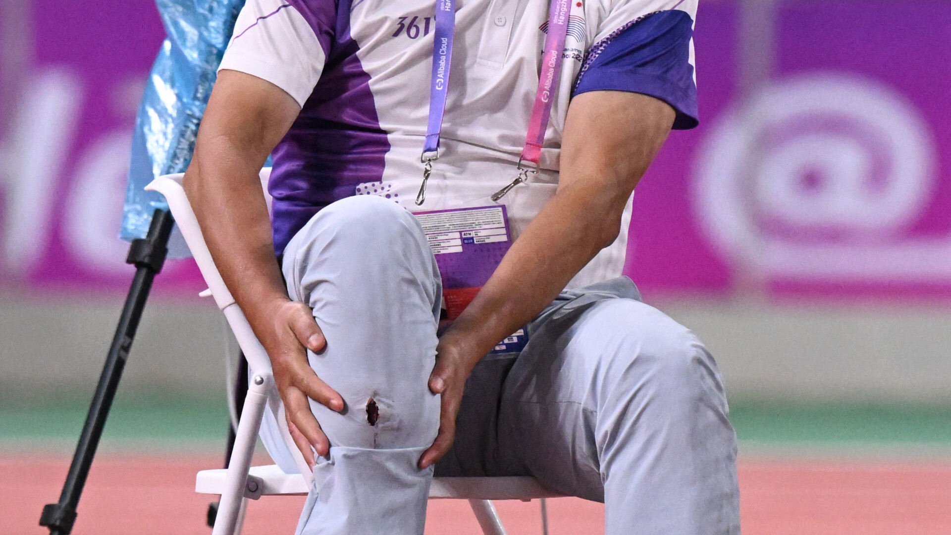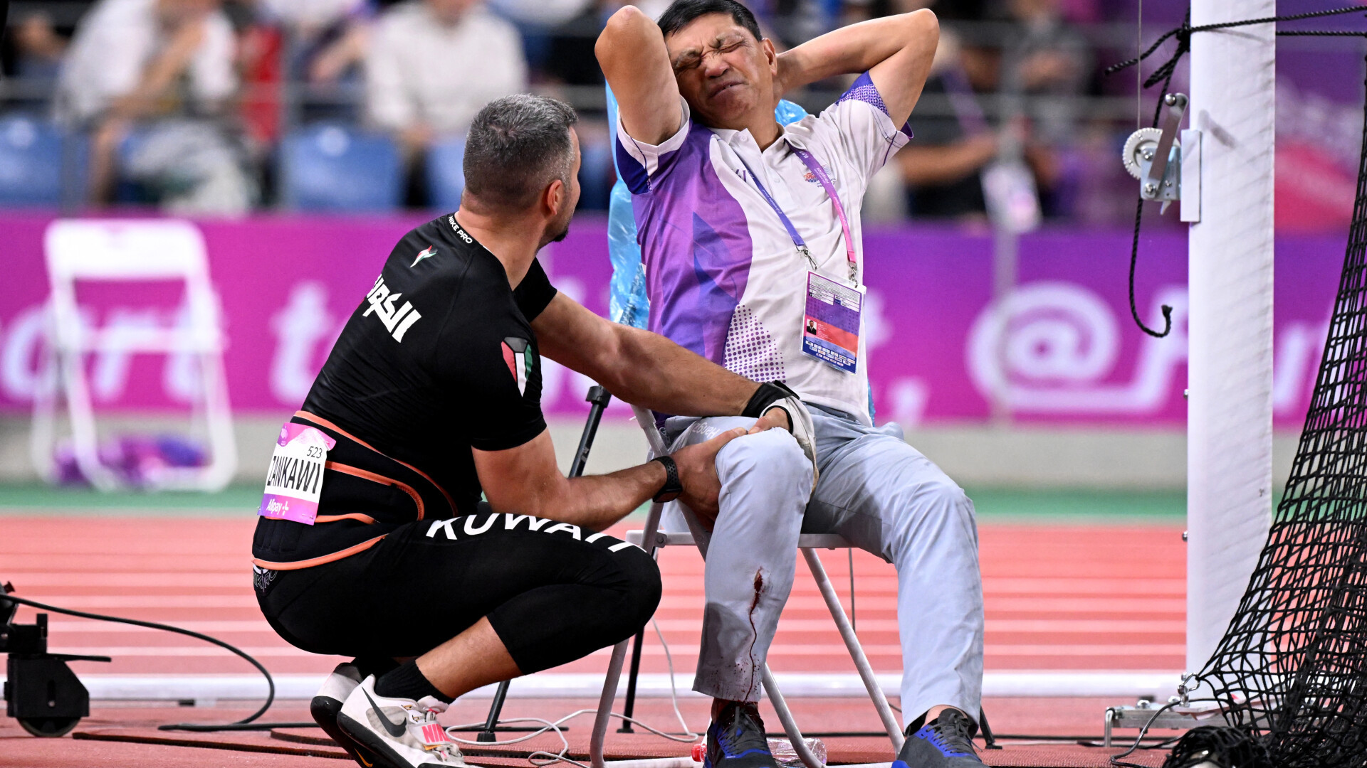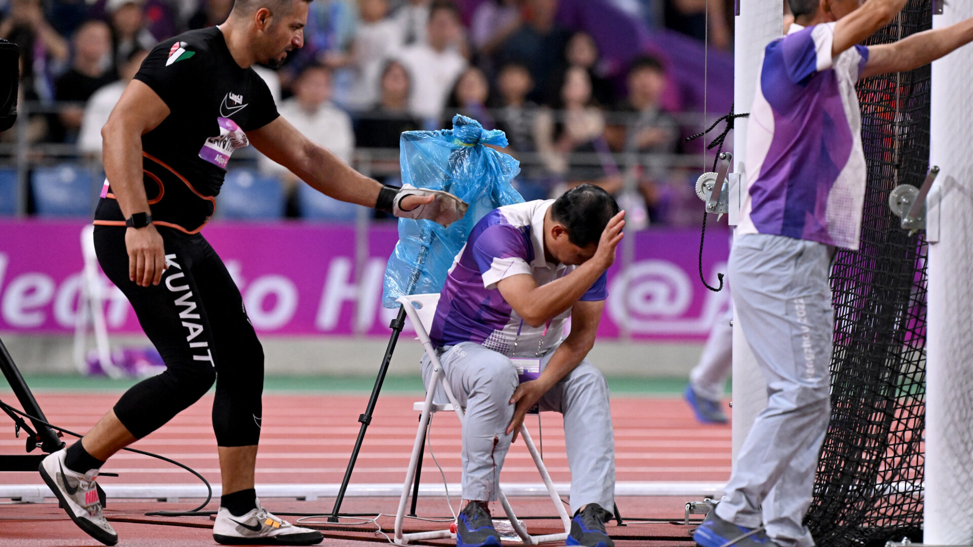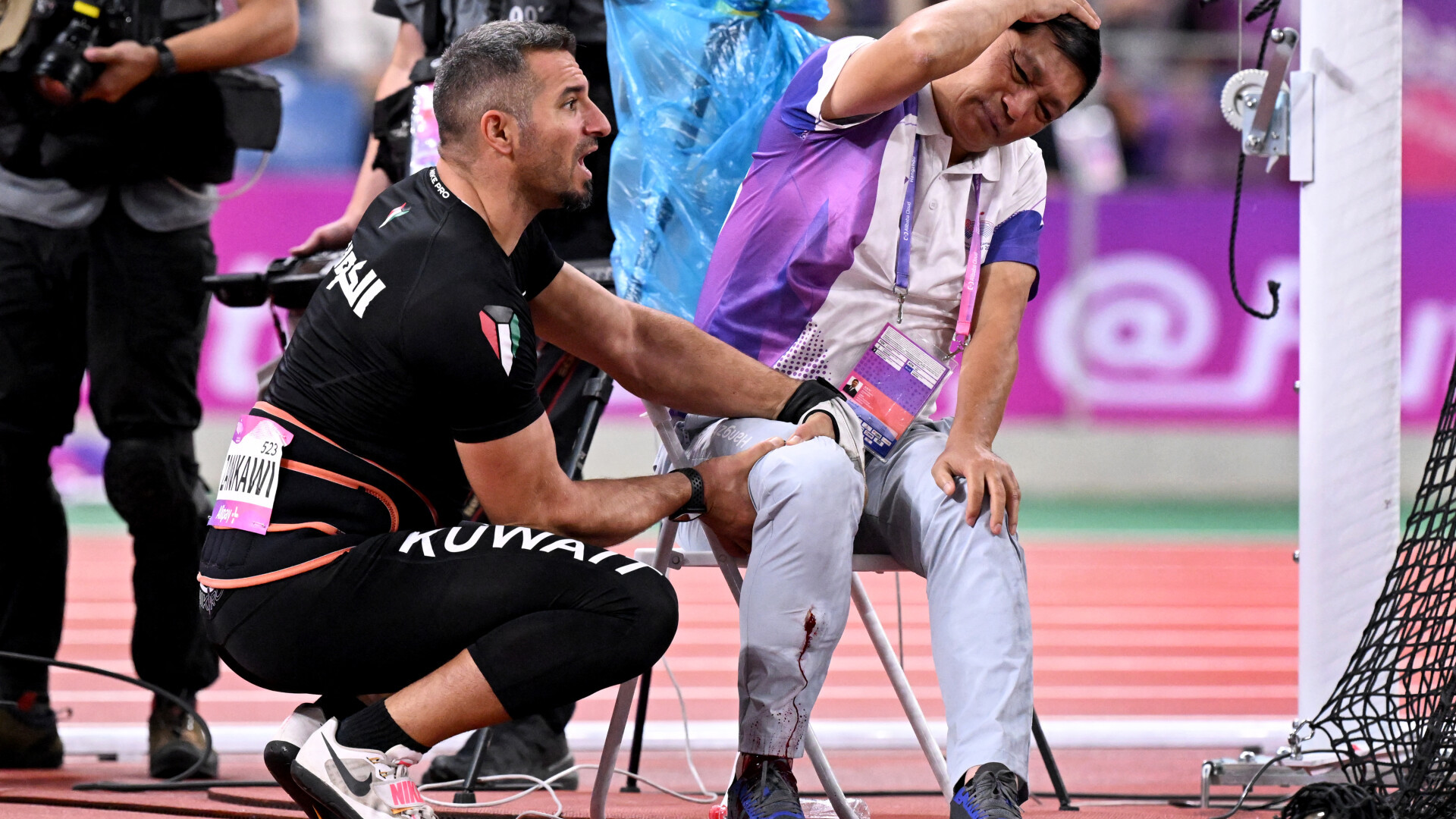 Sâmbătă, cu puţin înainte de ora 20.00 (12:00 GMT), kuweitianul Ali Zankawi s-a aliniat pentru una dintre aruncările sale în finala masculină de ciocan, pe stadionul olimpic plin de oameni din oraşul din estul Chinei. Dar, în loc să se îndrepte direct spre teren, ciocanul a zburat în lateral şi jos, spre dreapta, nimerind în piciorul oficialului tehnic care stătea jos.