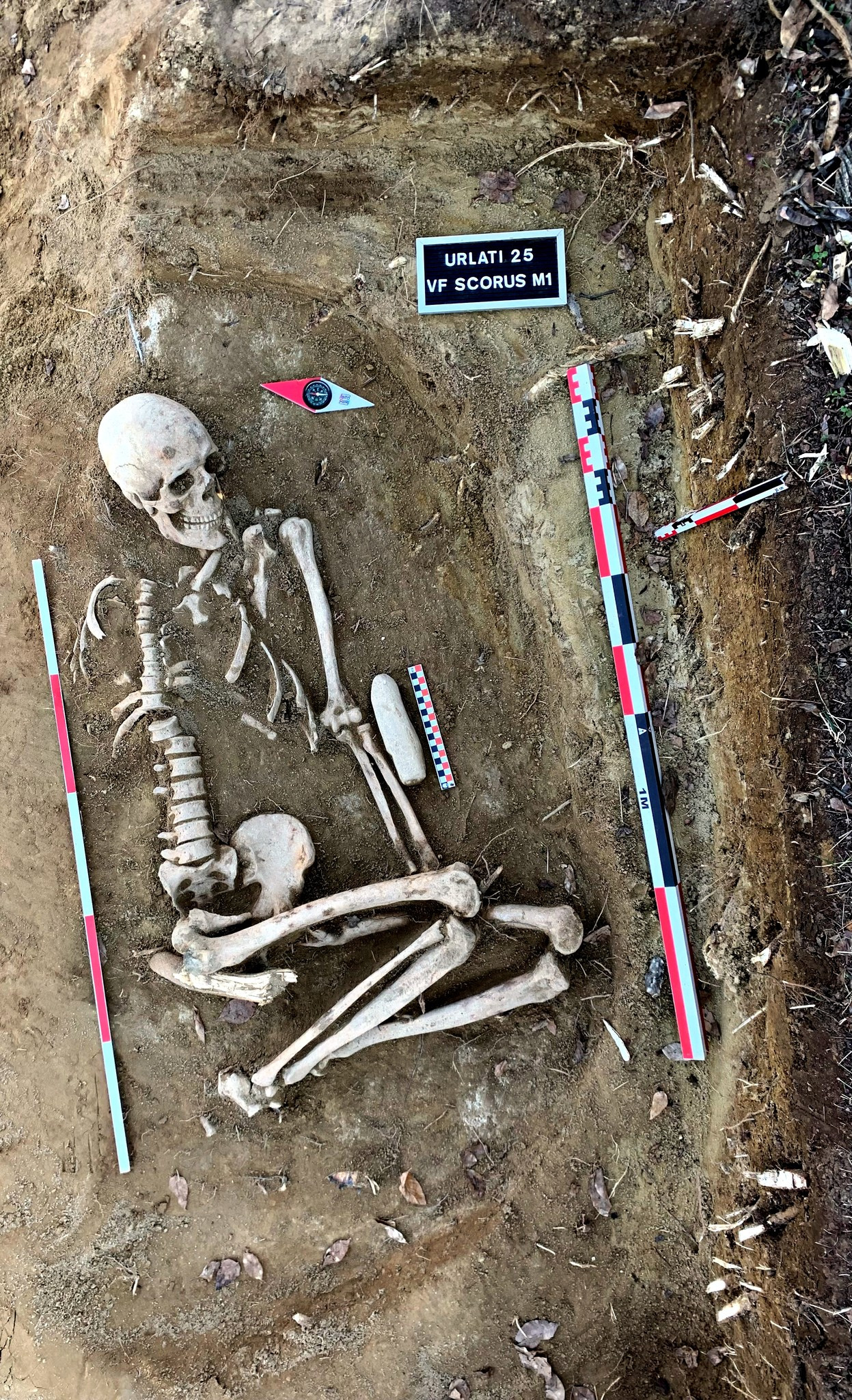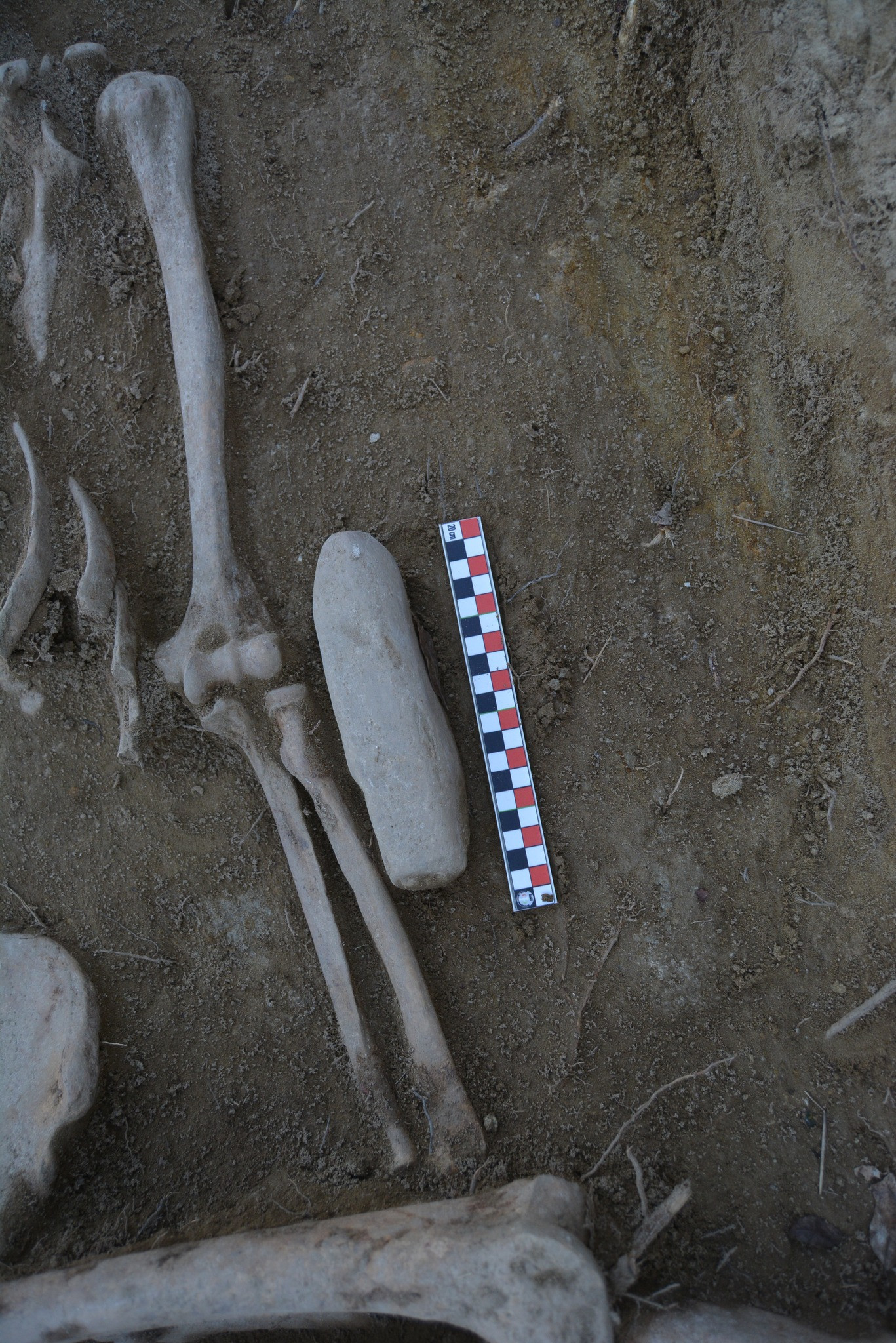 În apropierea braţului stâng avea depusă o piesă din piatră lungă de aproape 20 cm care ar putea reprezenta un topor. Au fost descoperite şi două mici fragmente ceramice care par să indice locuirea acestui deal într-o perioadă chiar mai veche decât mormântul identificat", se menţionează în postarea muzeografilor.