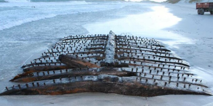 Epava a fost descoperită în februarie 2024, după ce o furtună a îndepărtat nisipul care o acoperea pe plaja Sanday, una dintre insulele Orkney, situate la nord de Scoţia.