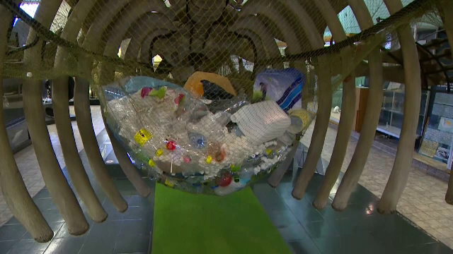 În interiorul scheletului unei balene, expus la Liege, au fost aşezate - pentru a trage un semnal de alarmă - 40 de kilograme de deşeuri din plastic.