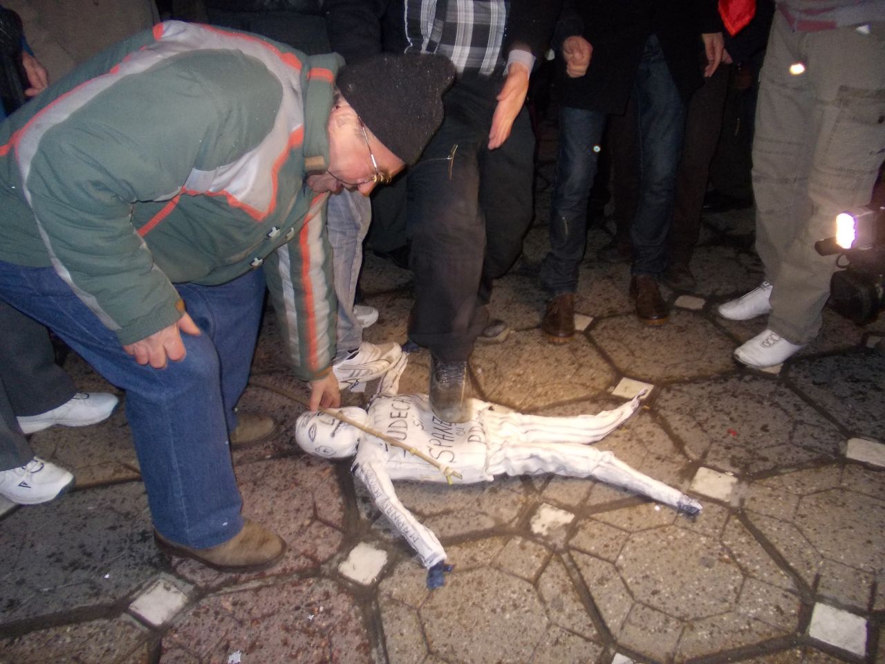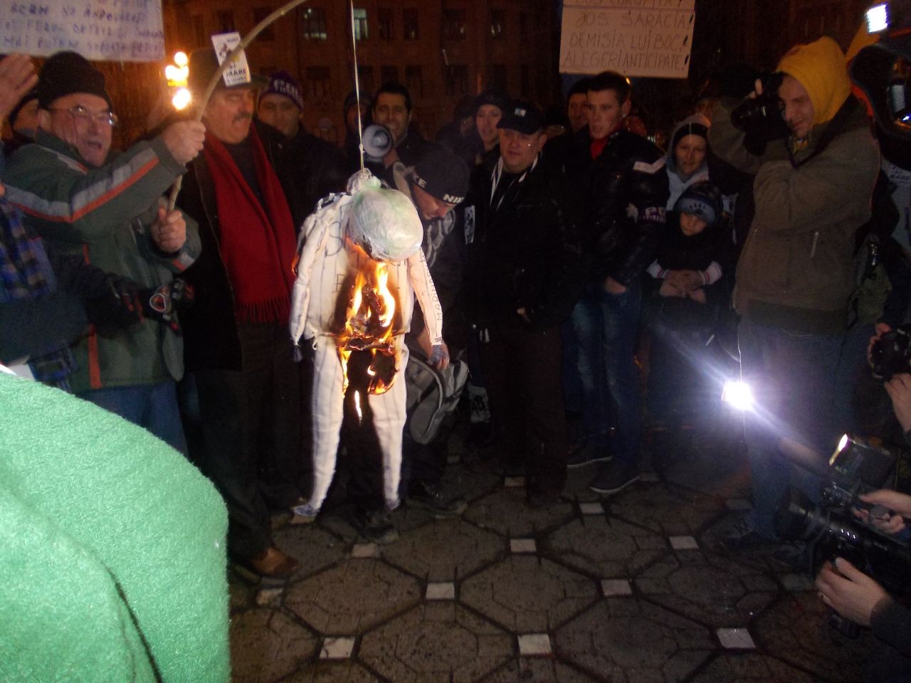 ORA 17.30 Cativa protestatari au dat foc unei papusi facute din carpe, pe care scria, pe o parte "Sa traiesti bine dupa gratii", iar pe cealalta "Judecat si spanzurat cu tot PDL-ul".