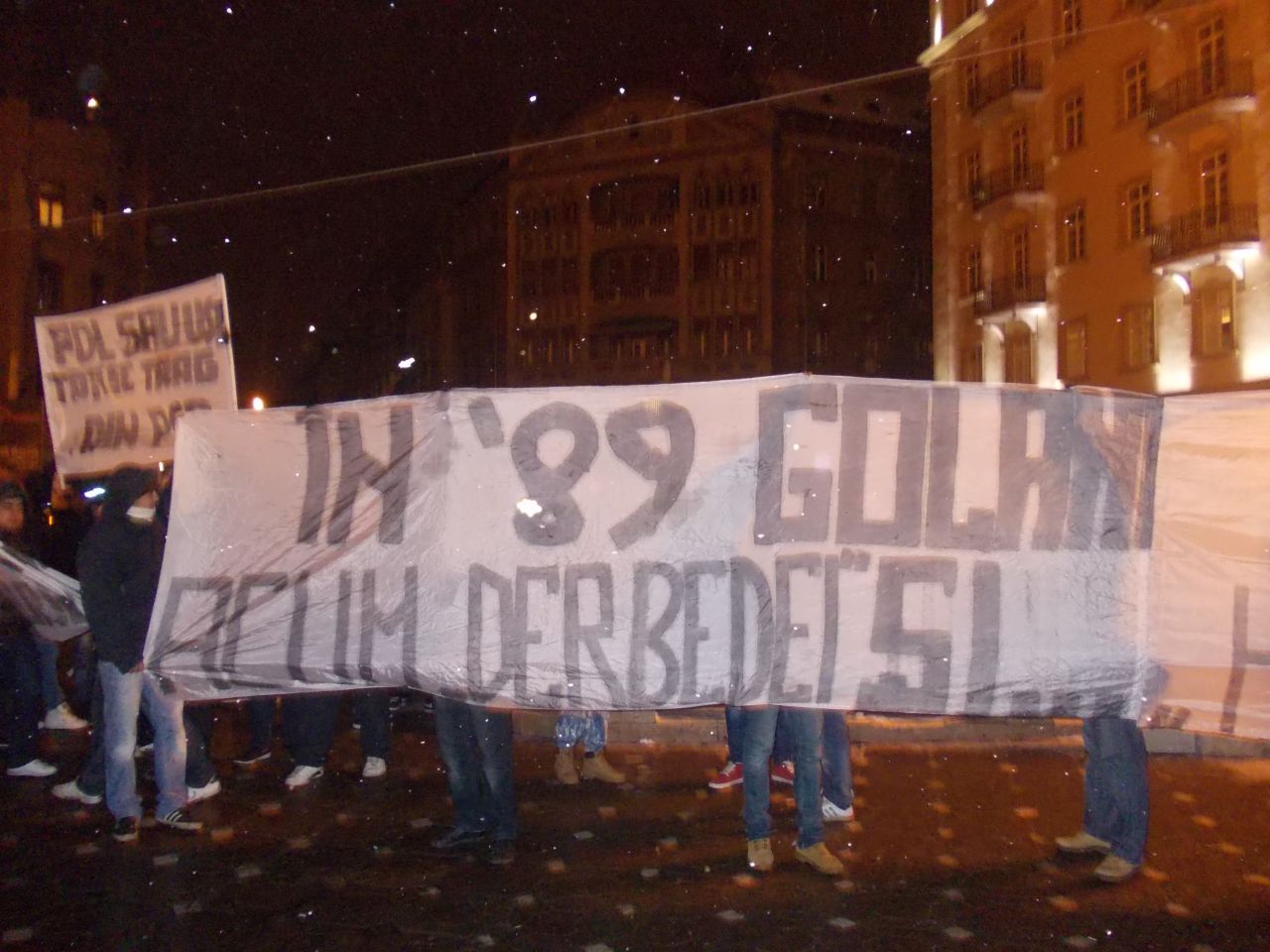 ORA 18 Suporterii lui Poli Timisoara au sosit in Piata Operei, numarul de protestatari ajungand la aproape 200. Acestia scandeaza "Romania, stat poliţionesc" si au pancarte pe care scrie "PDL sau USL, toti se trag din PCR", "Sustinem punctul 8", "In 89 golani, acum derbedei..huligani".