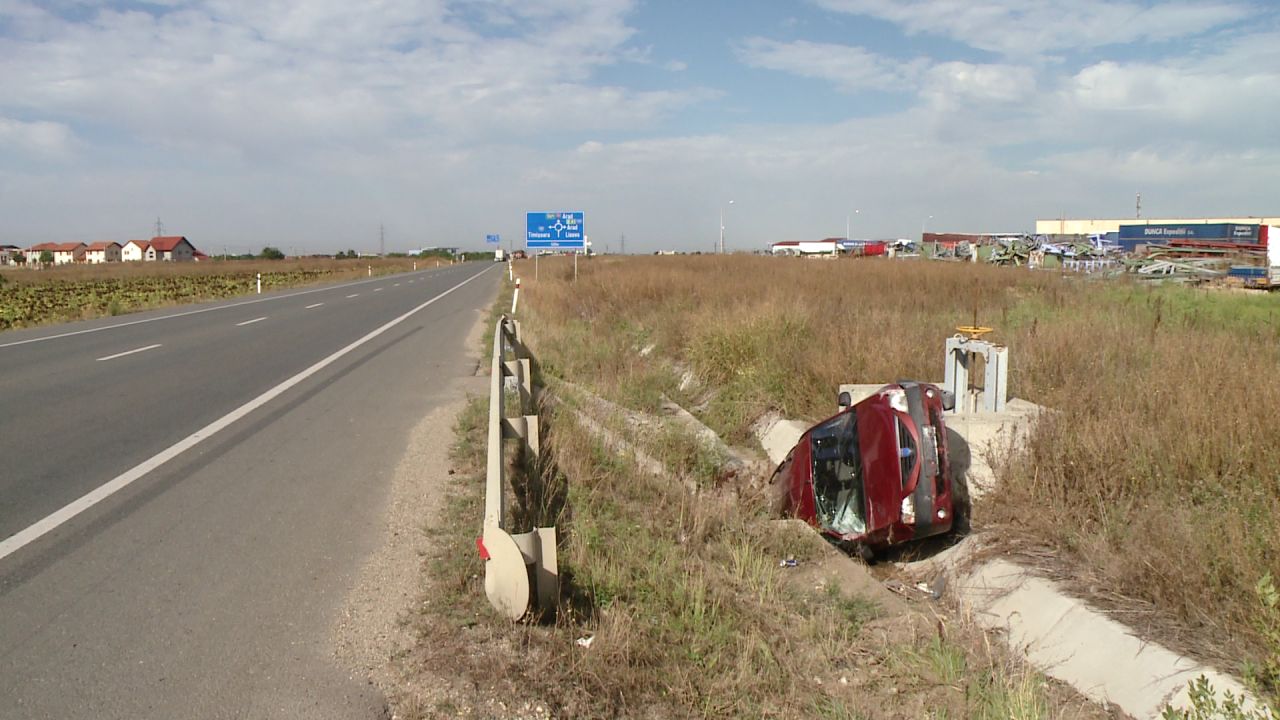 Soferul circula dinspre aeroport si se indrepta spre Dumbravita, iar portiunea de centura a depasit o masina. Cand a vrut sa revina pe banda sa, a pierdut controlul volanului. A ajuns cu masina direct in sant, iar la fata locului au sosit oamenii legii si o ambulanta.