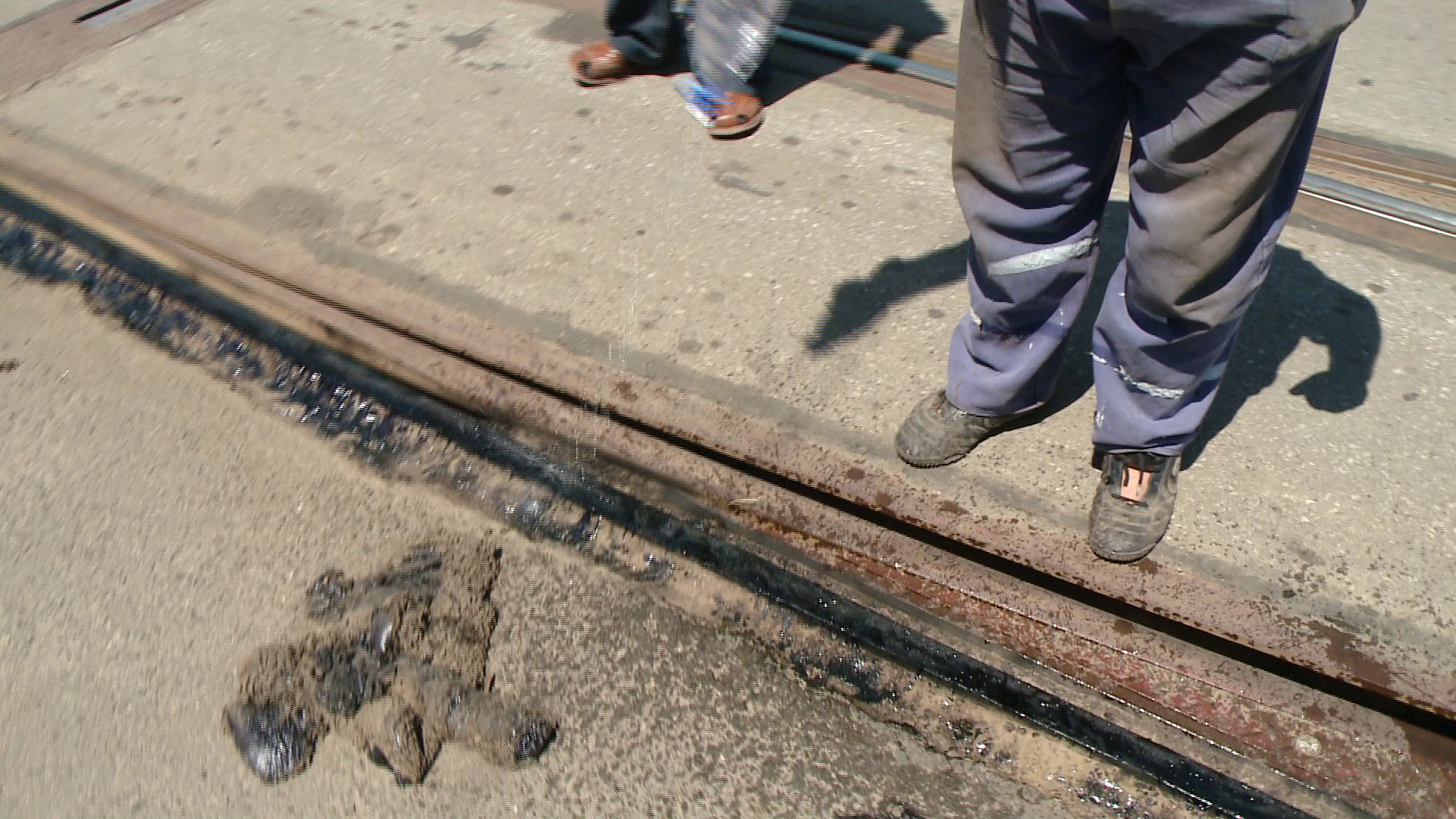 Temperaturile de peste 40 de grade au afectat stratul de izolatie de la baza sinelor de tramvai, pe linia 9 de pe Bulevardul Liviu Rebreanu. Din cauza caldurii, acesta s-a topit si a ajuns sinele mijloacelor de transport.