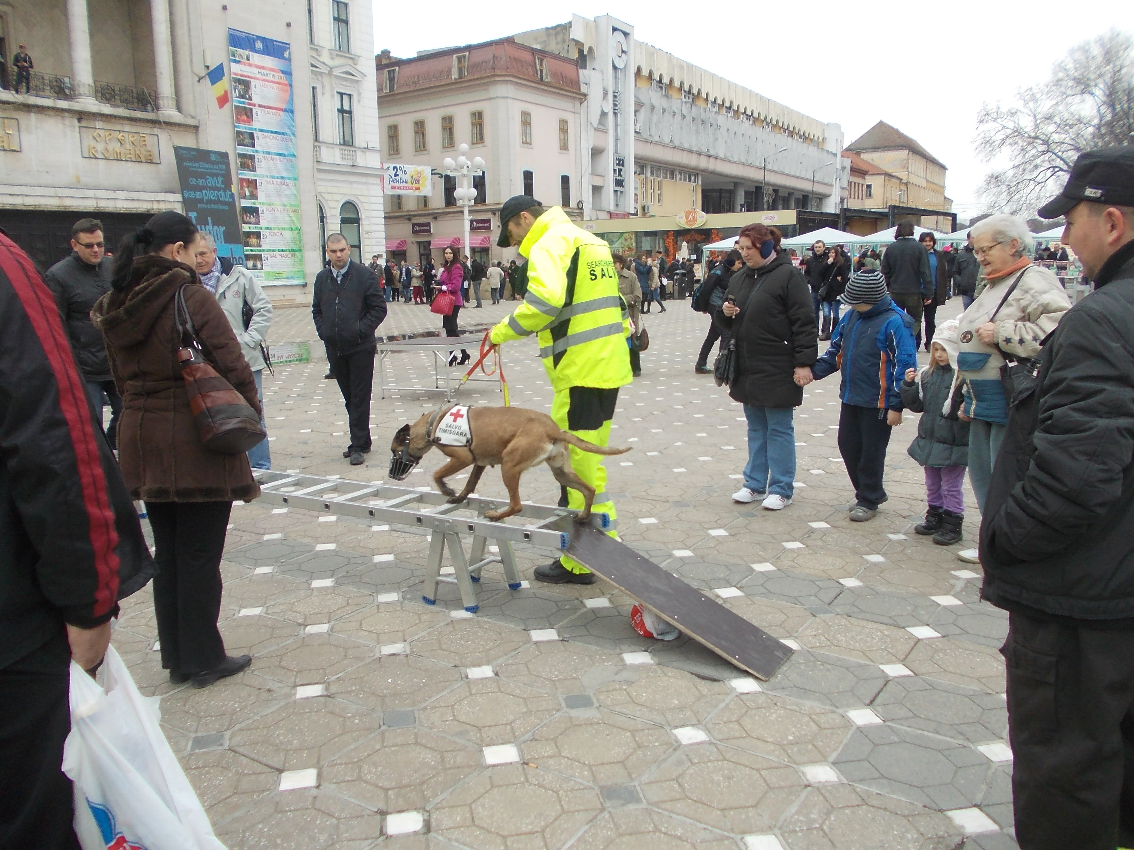 Peste 30 de voluntari de la Salvo si cinci caini special antrenati au oferit un adevarat spectacol, intr-o actiune demonstrativa, celor care au trecut joi prin centrul orasului. Cainii au sarit peste obstacole, au facut sprinturi, iar voluntarii i-au invatat pe copii sa coboare de pe Teatrul National “Mihai Eminescu”, pe o franghie speciala.