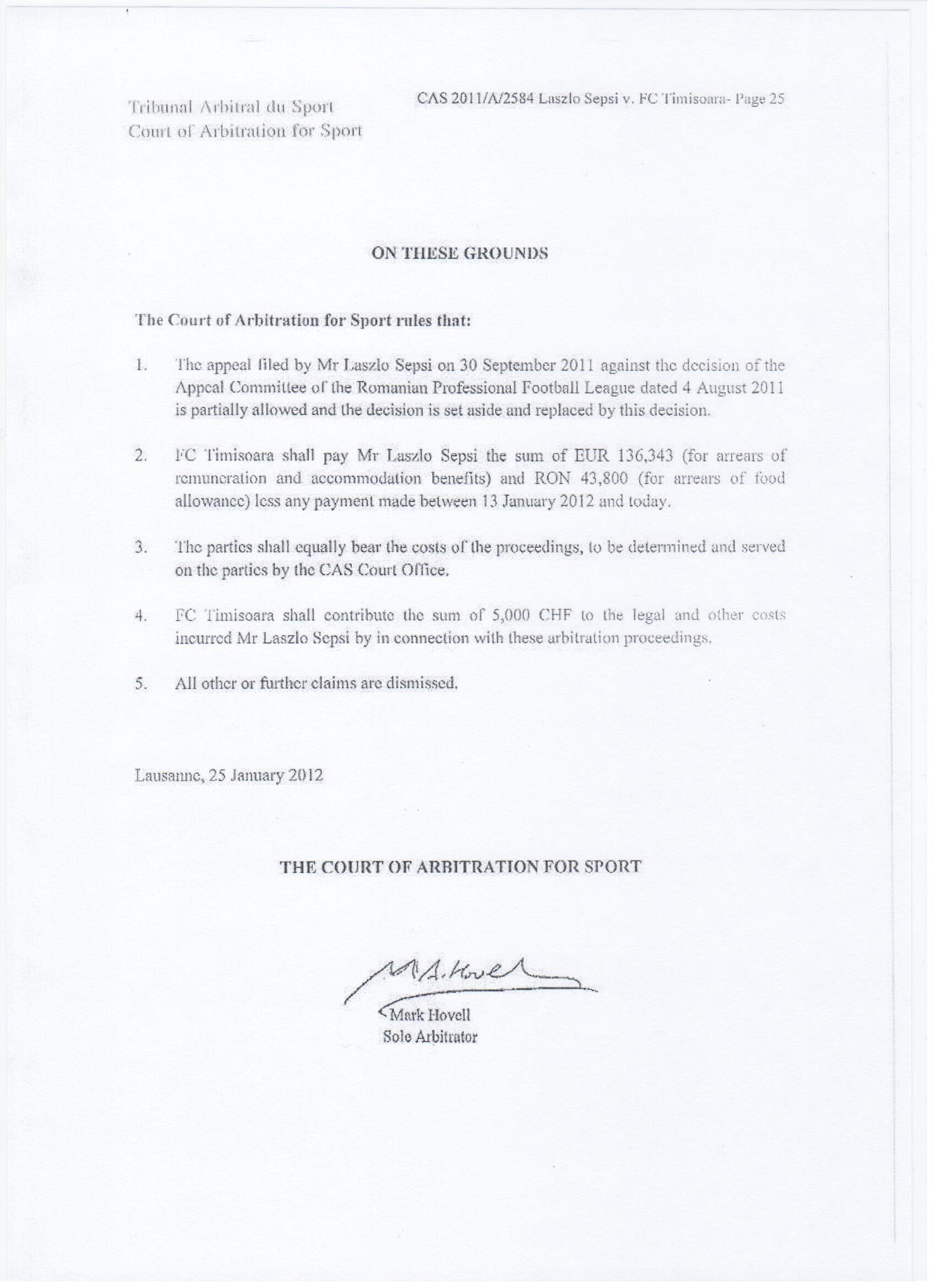 Site-ul oficial al lui Poli Timişoara a publicat astăzi documentul cu sentinţa dată de TAS în cazul Sepsi. În decizia tribunalului de la Lausanne nu se specifică nimic despre schimbarea contractului între Sepsi şi clubul timişorean, ci doar faptul că Poli trebuie să-i dea jucătorului 136.000 de euro şi 43.800 de lei.
