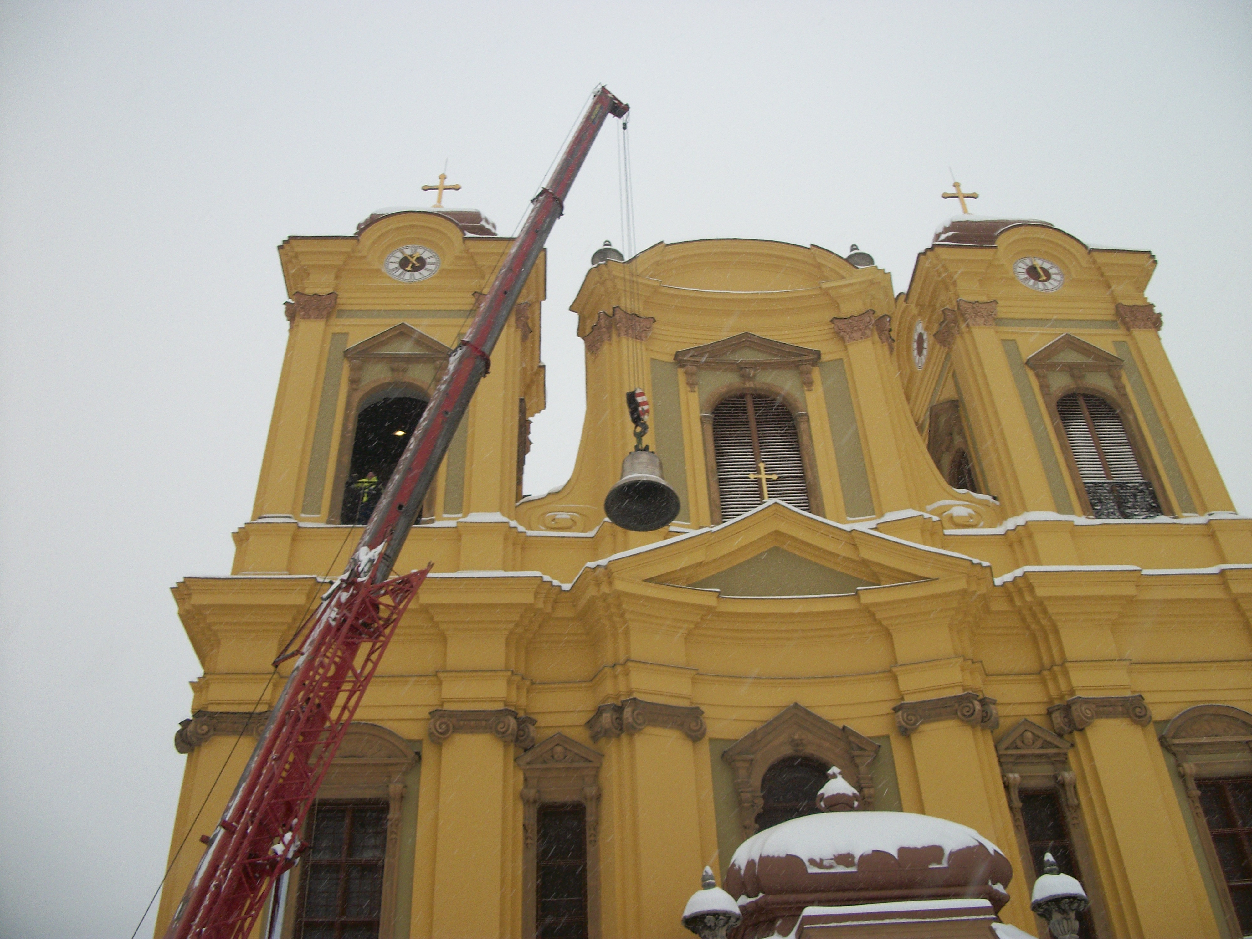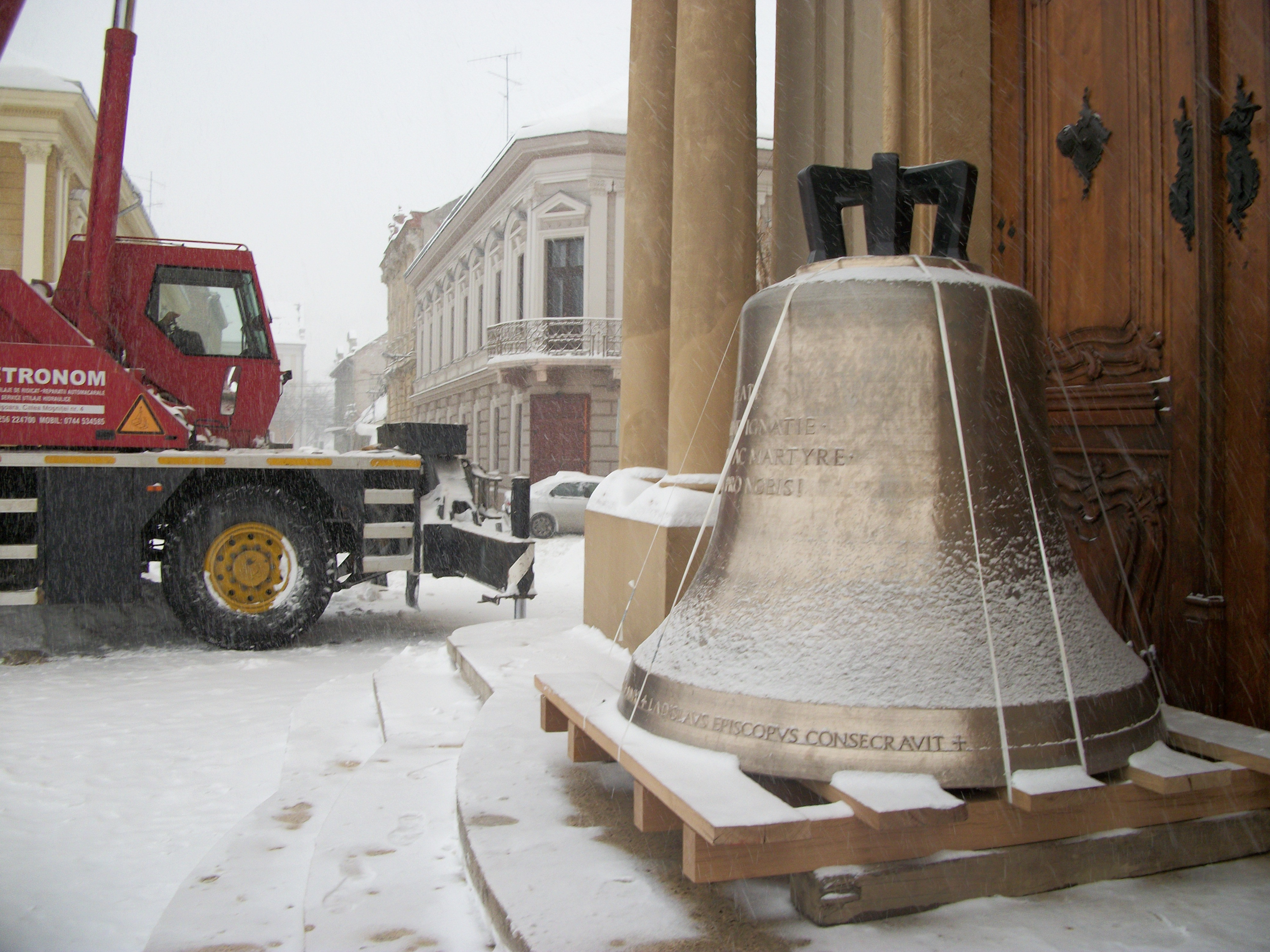 Misiune cu greutate. Clopot de aproape trei tone, urcat in Domul Romano-Catolic din Piata Unirii