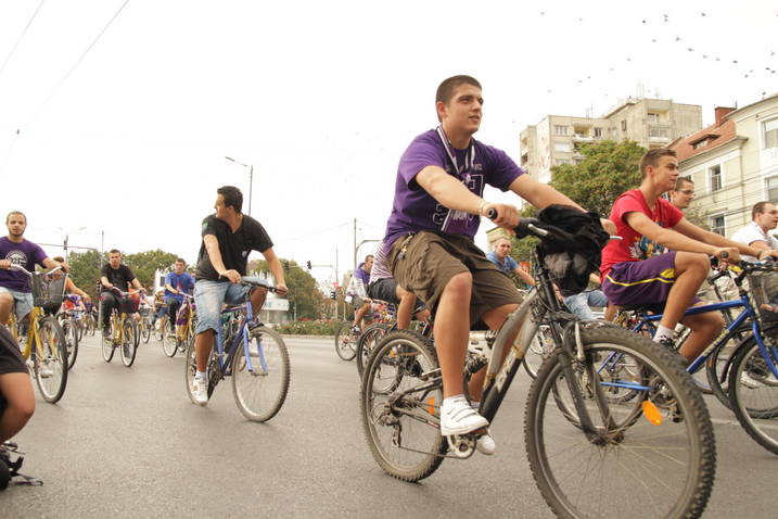 Însoţiţi de cinci maşini de poliţie, pentru ca totul să se desfăşoare regulamentar, peste 200 de oameni au început să pedaleze, cu eşarfa violetă, fularul sau steagul legat de ghidon. Traficul nu a avut foarte mult de suferit, iar cele mai multe claxoane au avut ca însemnătate admiraţia şoferilor pentru convoiul de biciclişti, care pedalează pentru a vedea un meci de fotbal din campionatul judeţean. Până la Pădurea Verde, s-au mai strâns circa o sută de biciclişti, în această deplasare de neuitat. Poli a avut în această deplasare aproape 500 de suporteri, cu tot cu cei care s-au deplasat cu maşinile.