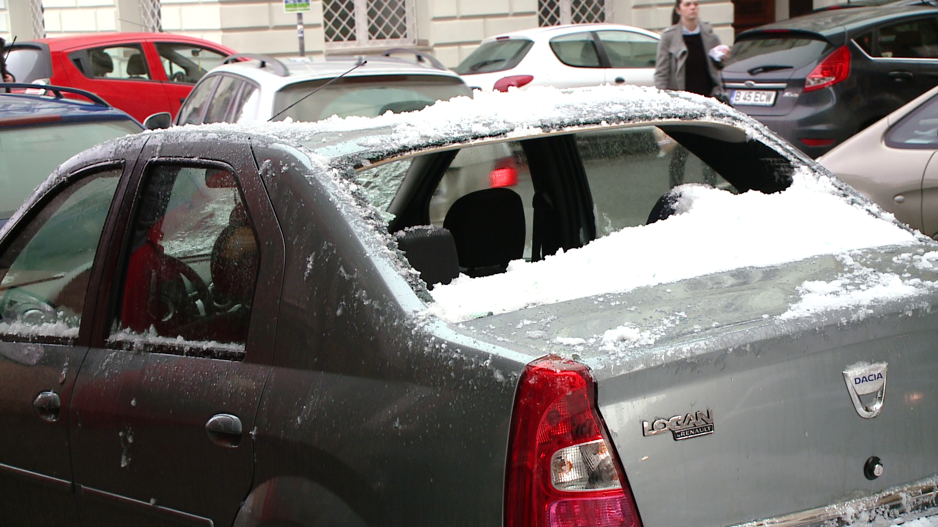 Oamenii au vazut negru in fata ochilor cand si-au gasit masinile serios avariate de zapada inghetata care a cazut de pe acoperis. Pagubele nu sunt mici, insa, din fericire pentru unii soferi, masinile lor sunt asigurate.