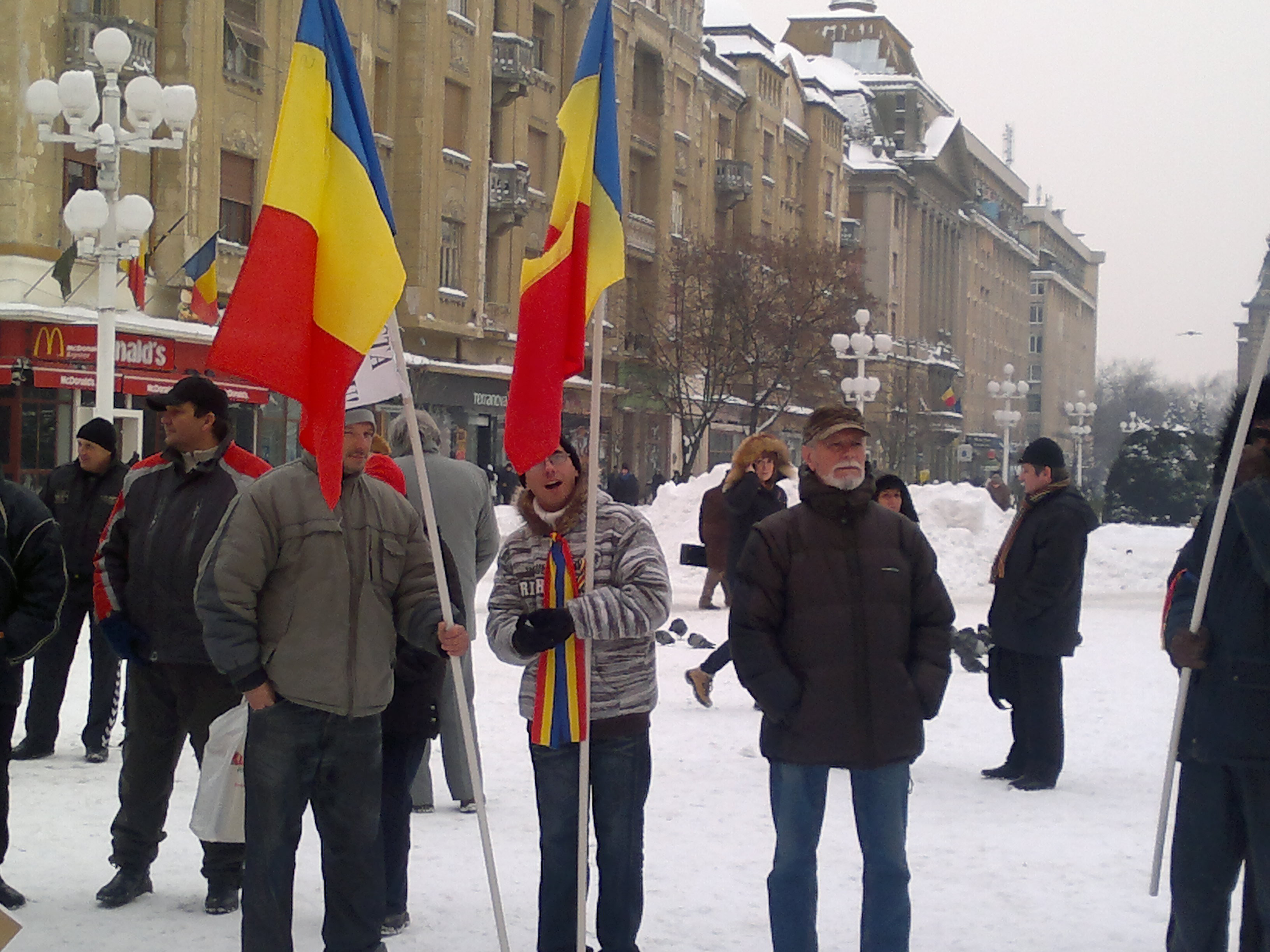 Chiar daca in ultimele zile temperaturile au scazut pana la -10 grade in timpul zilei la Timisoara, oamenii nu se lasa nicicum induplecati. Mesajele lor sunt scrise pe hartie si fluturate in mod repetat, cateva zeci de minute, in fiecare zi. “Romania nu este neam de hoti”, “De ce ne furati domnilor?” sau “Stop ACTA” sunt cateva dintre mesajele manifestantilor. Pe langa pancarte, acestia flutura si cateva drapeluri nationale.