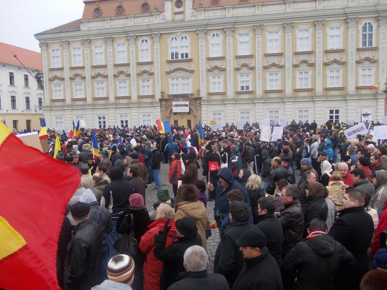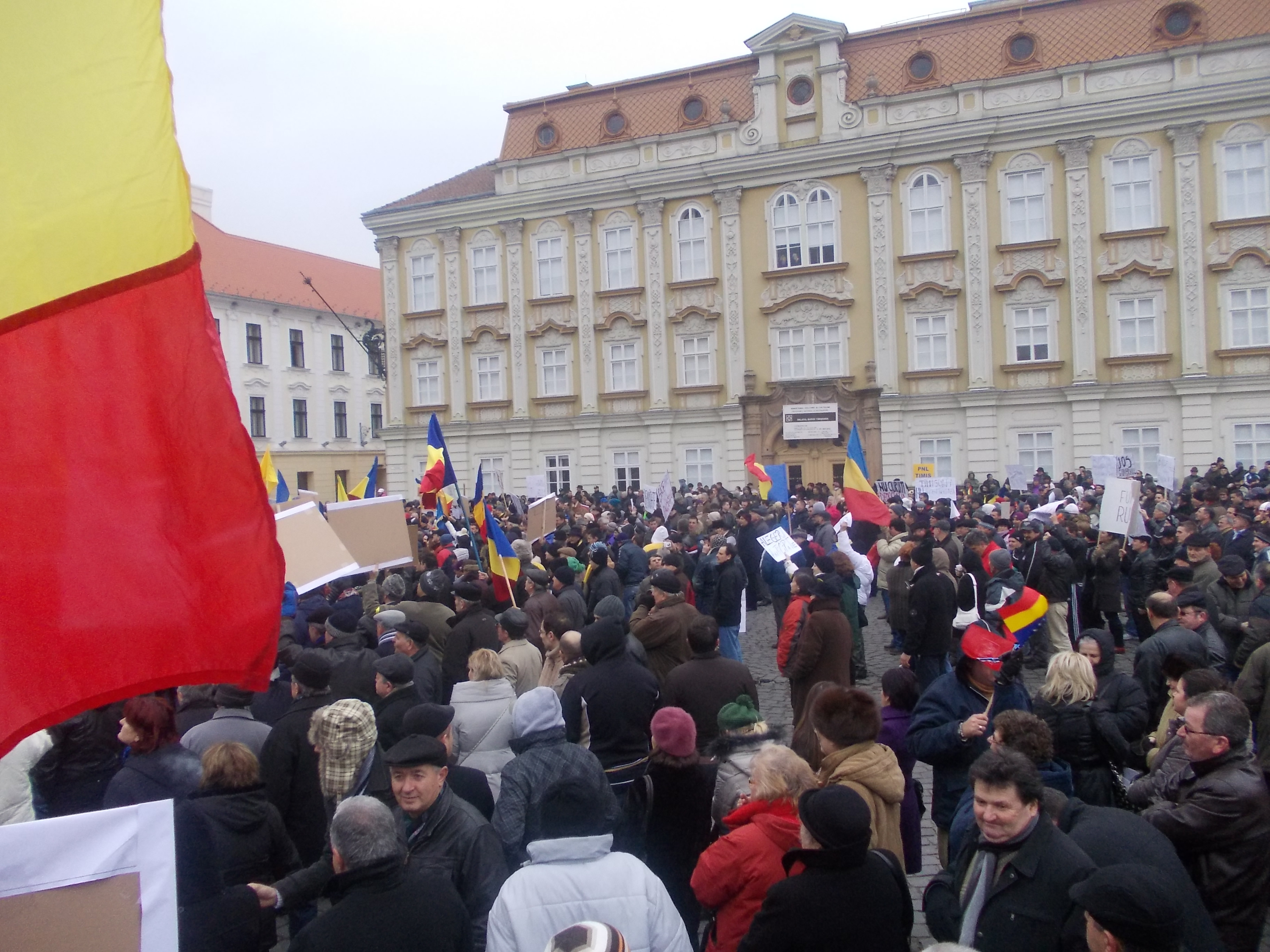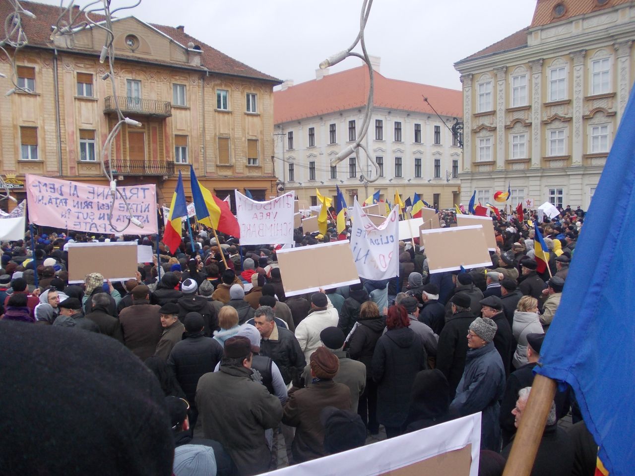 Mitingul din Piata Unirii a inceput la ora 15 si a strans oameni din Mosnita Noua, Sannicolau Mare, Jimbolia si alte localitati de pe toata suprafata judetului Timis.