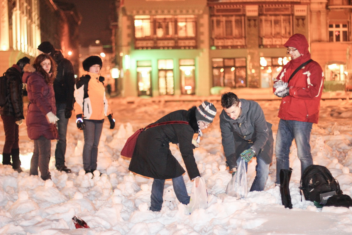 Peste treizeci de timisoreni si-au unit aseara fortele pentru a realiza o armata de monstruleti din zapada, in Piata Unirii.