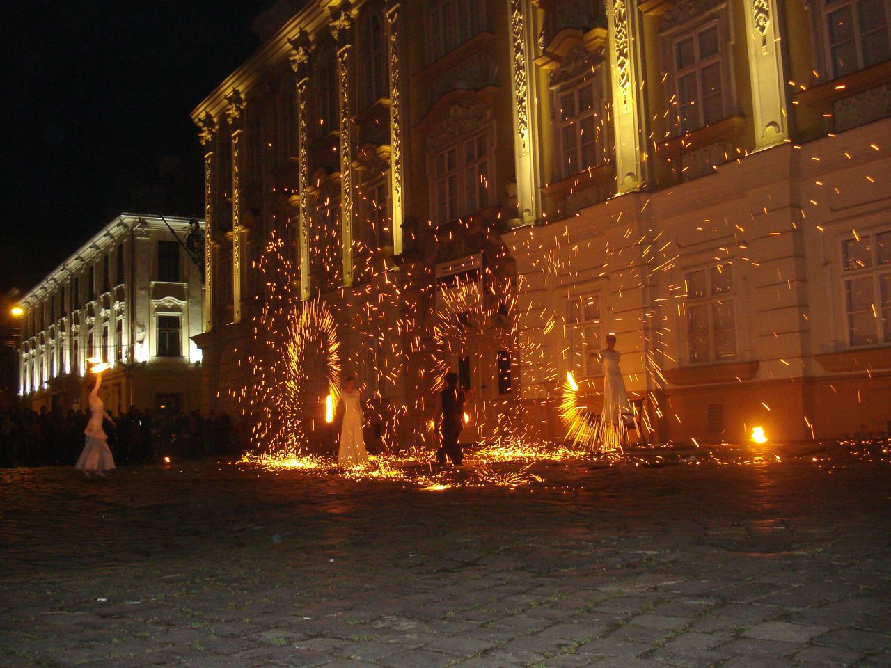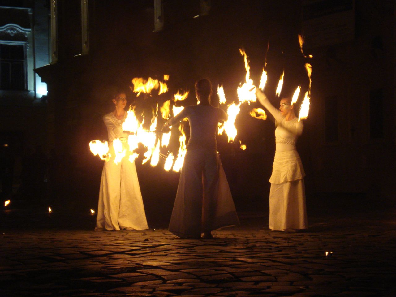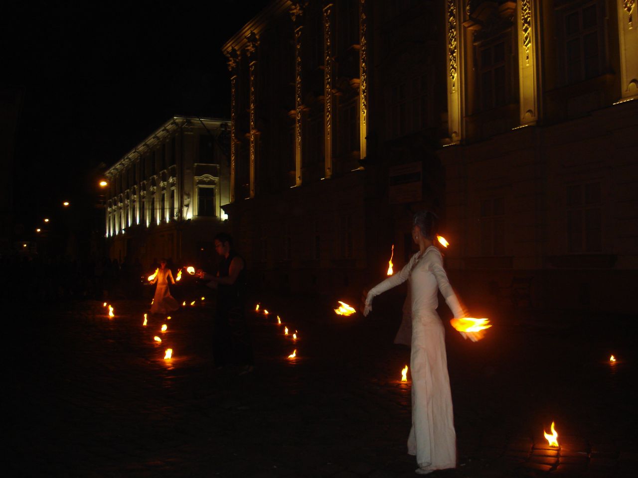 Dupa lasarea serii, zeci de timisoreni s-a strans in Piata Unirii si au urmarit cu sufletul la gura jongleriile cu foc ale trupei Shadows. Demonstratiile s-au desfasurat pe ritmuri de muzica baroca.