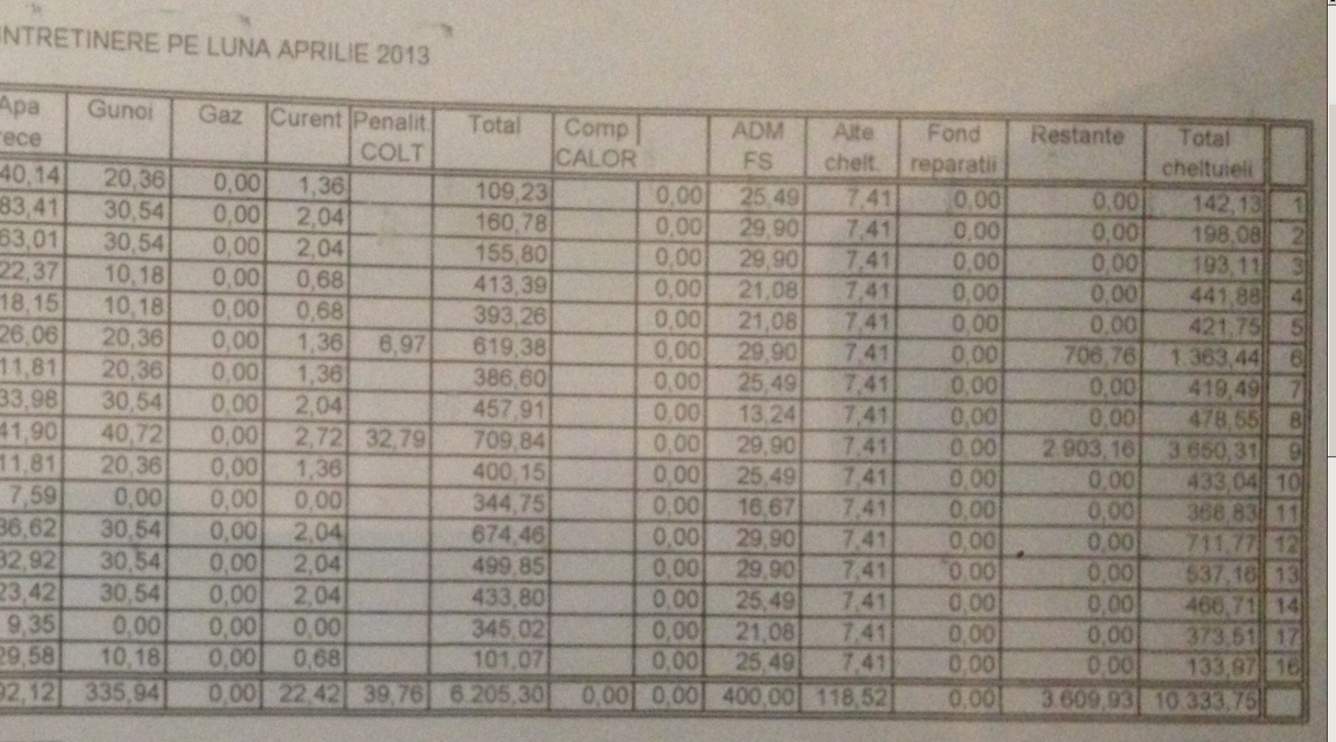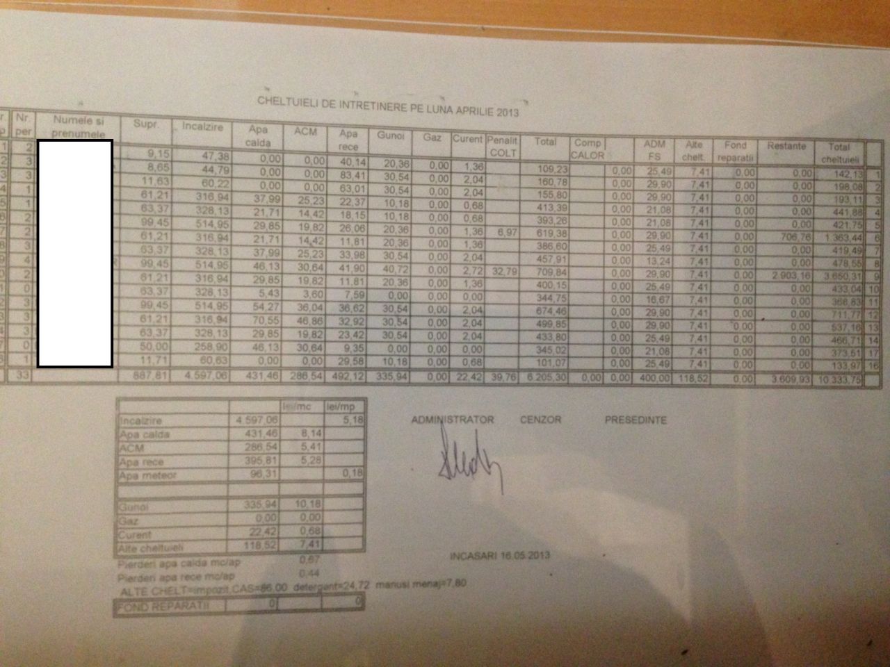 Situatia este mult mai grava in zona Steaua. Un alt timisorean a platit la intretinere pentru luna martie suma 212 lei, pentru acelasi tip de apartament. Pentru ca societatea Colterm a decis sa tina caloriferele incalzite si in luna aprilie, timisoreanul a platit la intretinere suma de 440 de lei.