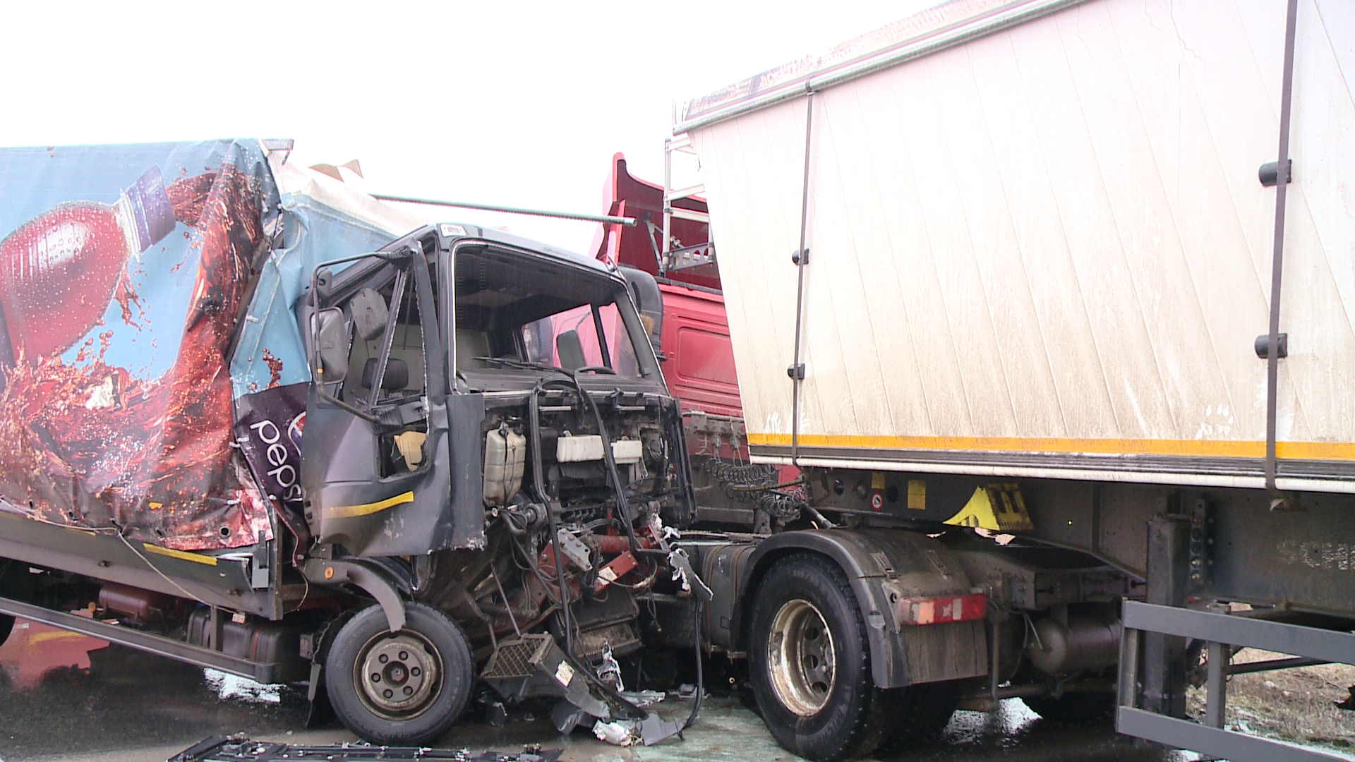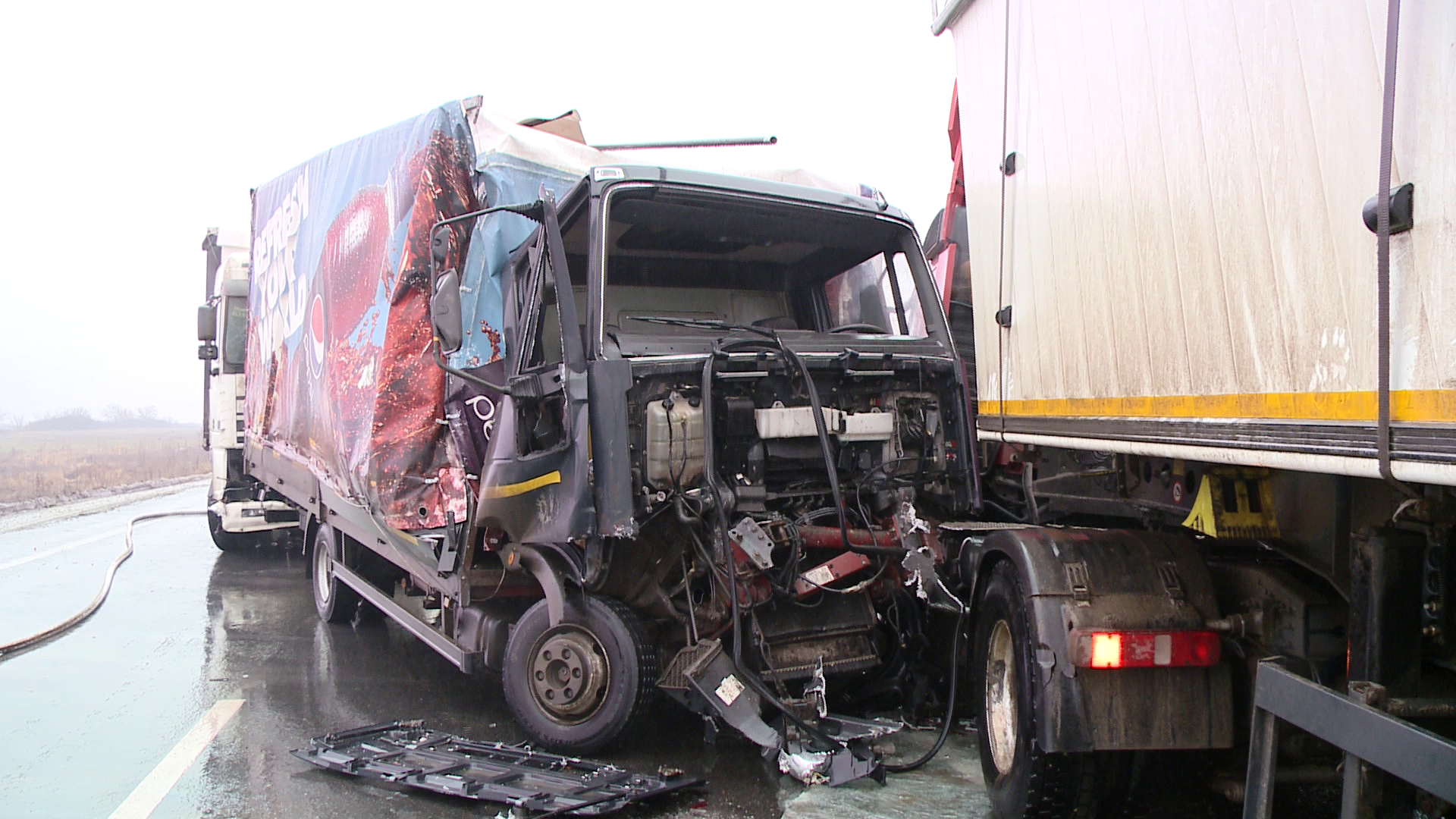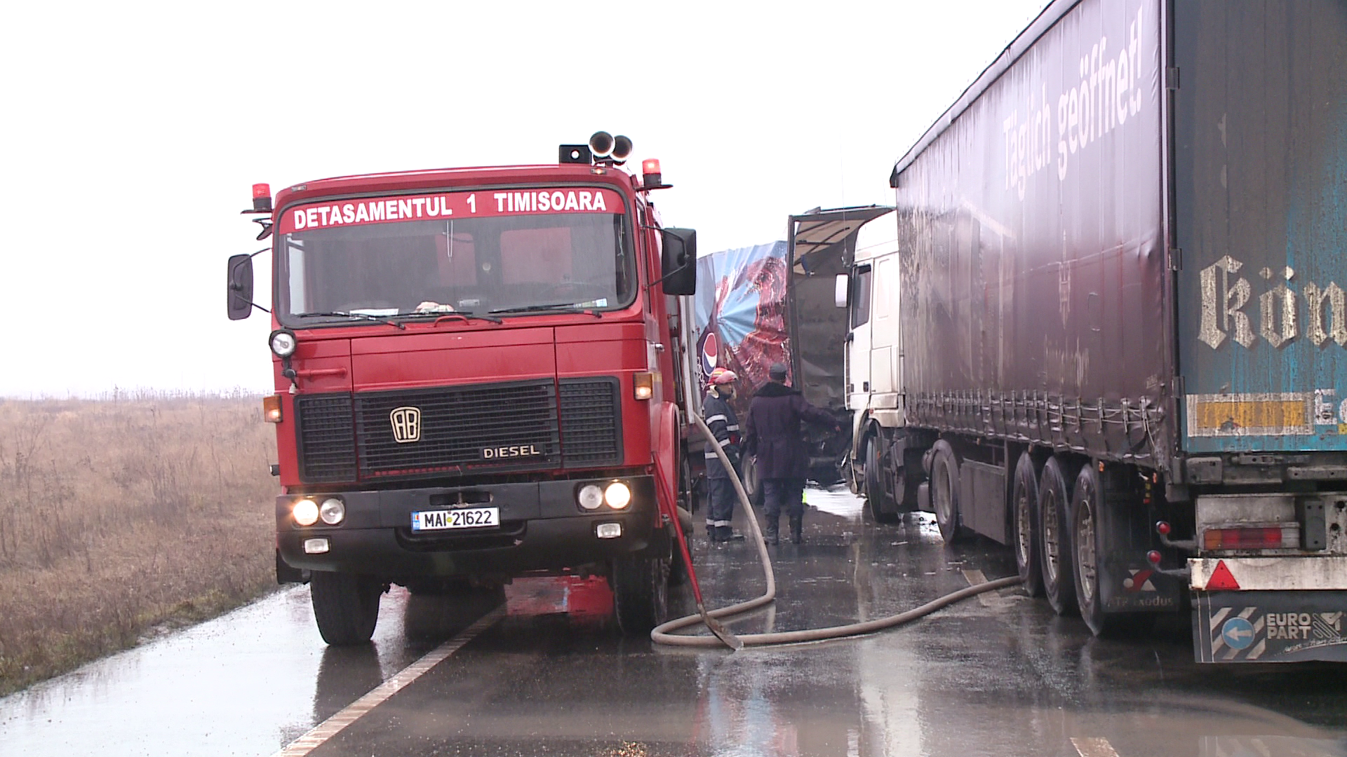 In urma coliziunii, TIR-ul lovit a ajuns pe sensul opus al drumului, unde a lovit un alt autotren care circula regulamentar.