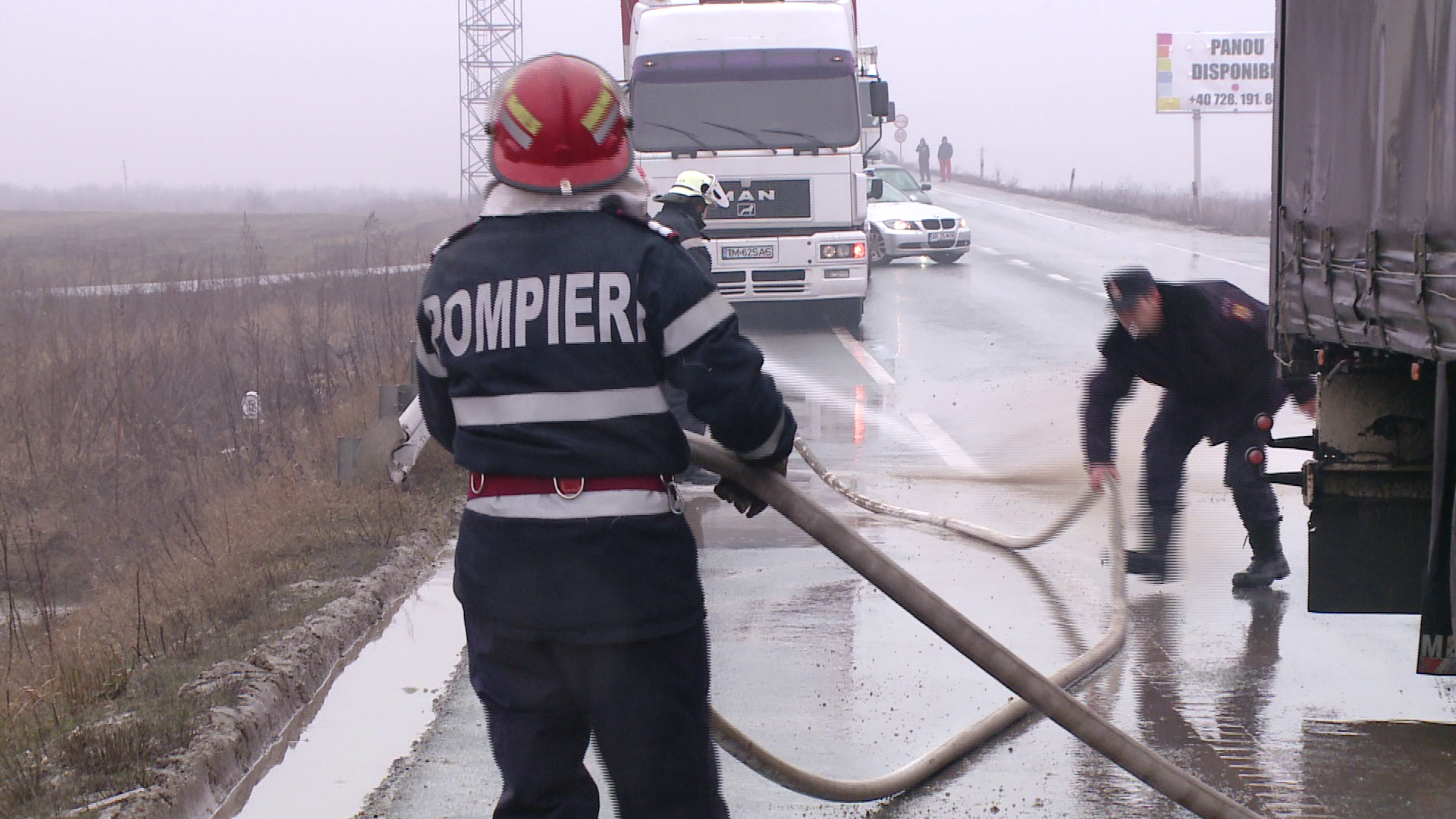 La fata locului au ajuns si pompierii care au curatat soseaua de combustibilul care a curs in urma coliziunii dintre cele trei TIR-uri.