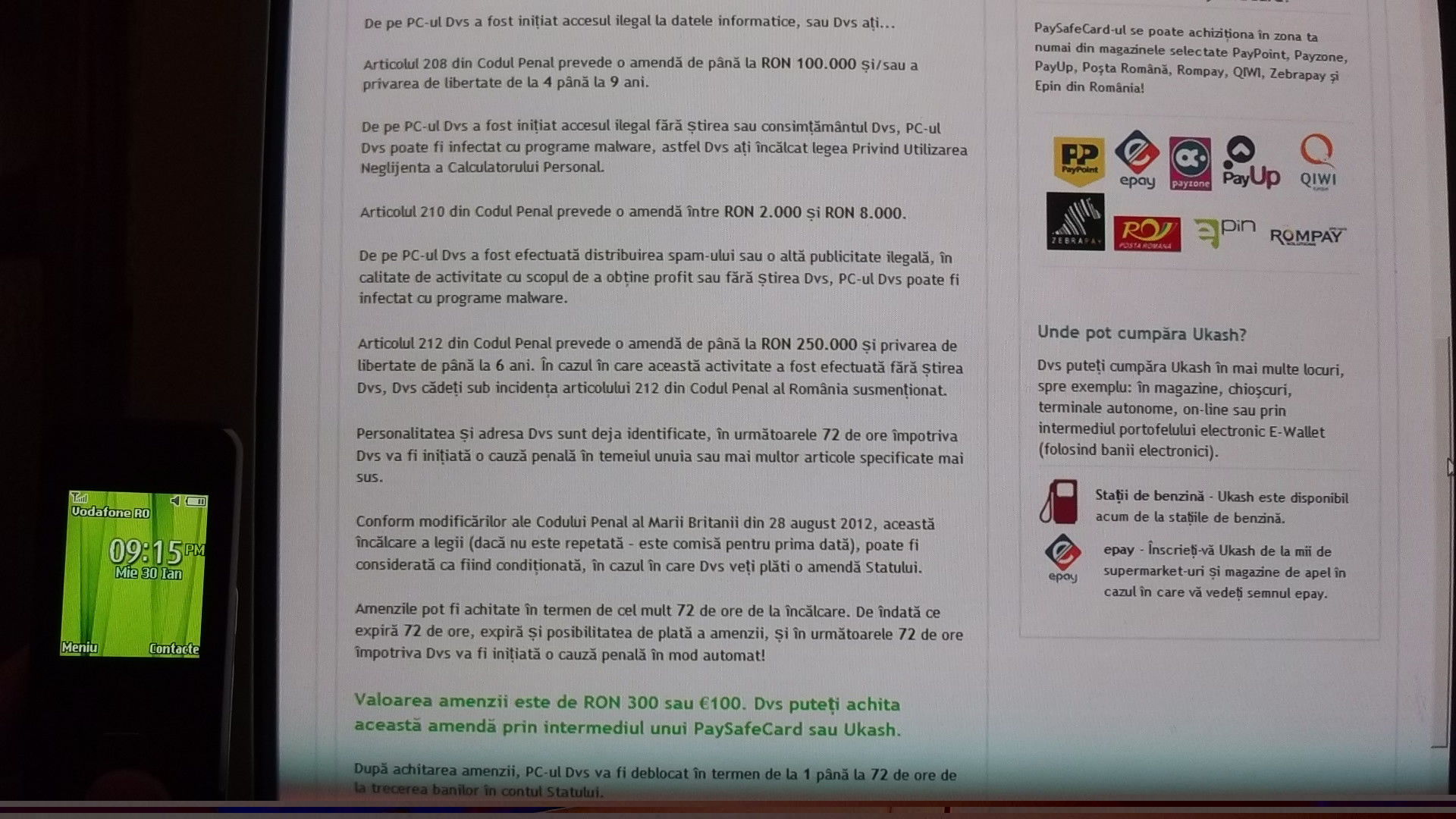 Este un virus care face ravagii in calculatorul. Virusul ii transmite “victimei” ca mesajul este din partea politiei si o acuza de un delict pe care l-ar fi comis. Acest mesaj, denumit “Virusul Politia Romana”, acuza utilizatorii de piratarea de muzica, software si videoclipuri, solicitandu-le bani pentru deblocarea calculatoarelor.