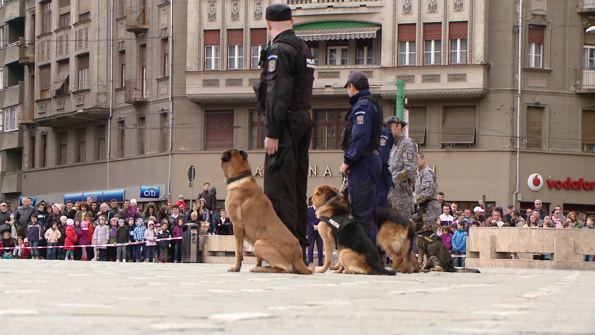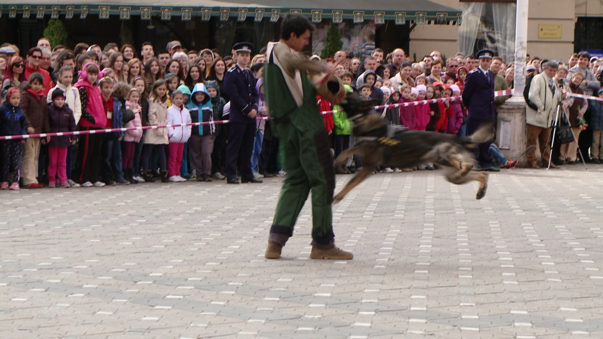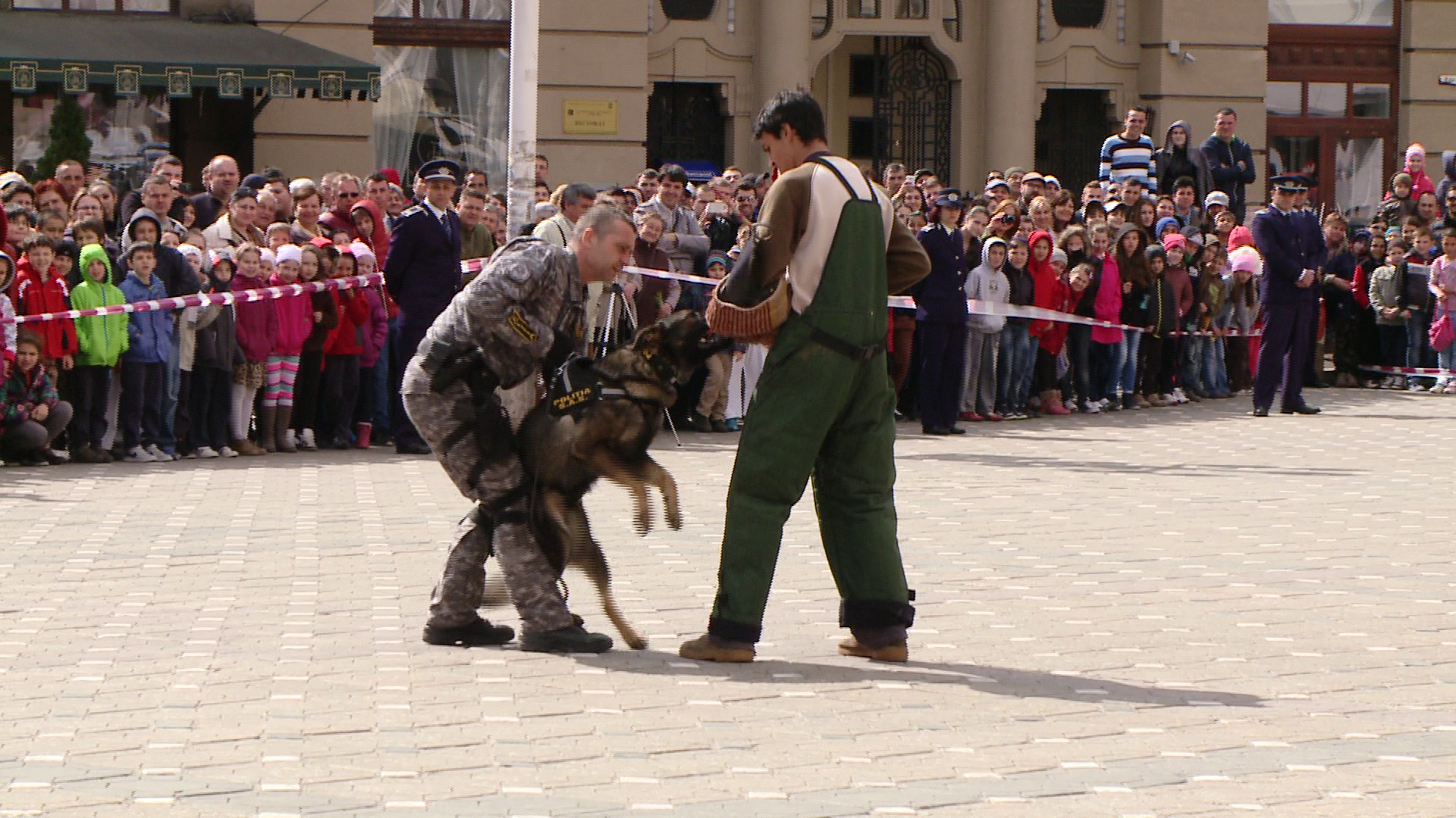 Zeci de timisoreni care au trecut astazi prin centrul orasului au luat parte la un spectacol inedit, oferit de politistii din cadrul Inspectoratului de Politie Judetean Timis.