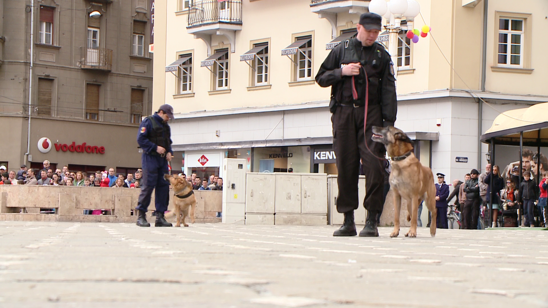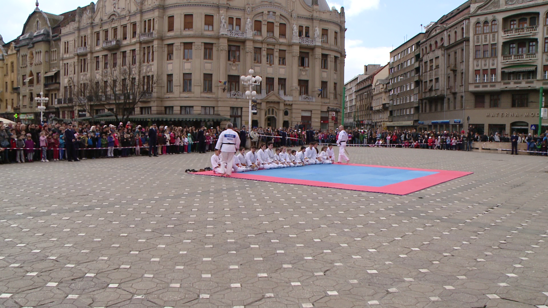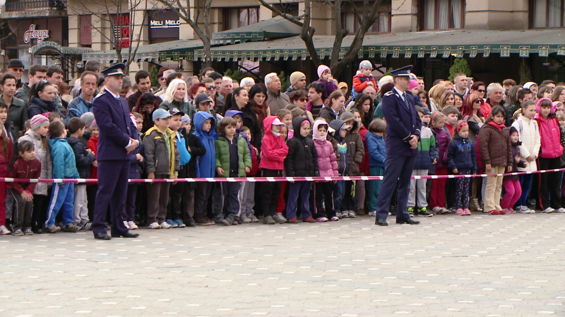 Zeci de timisoreni care au trecut astazi prin centrul orasului au luat parte la un spectacol inedit, oferit de politistii din cadrul Inspectoratului de Politie Judetean Timis.
