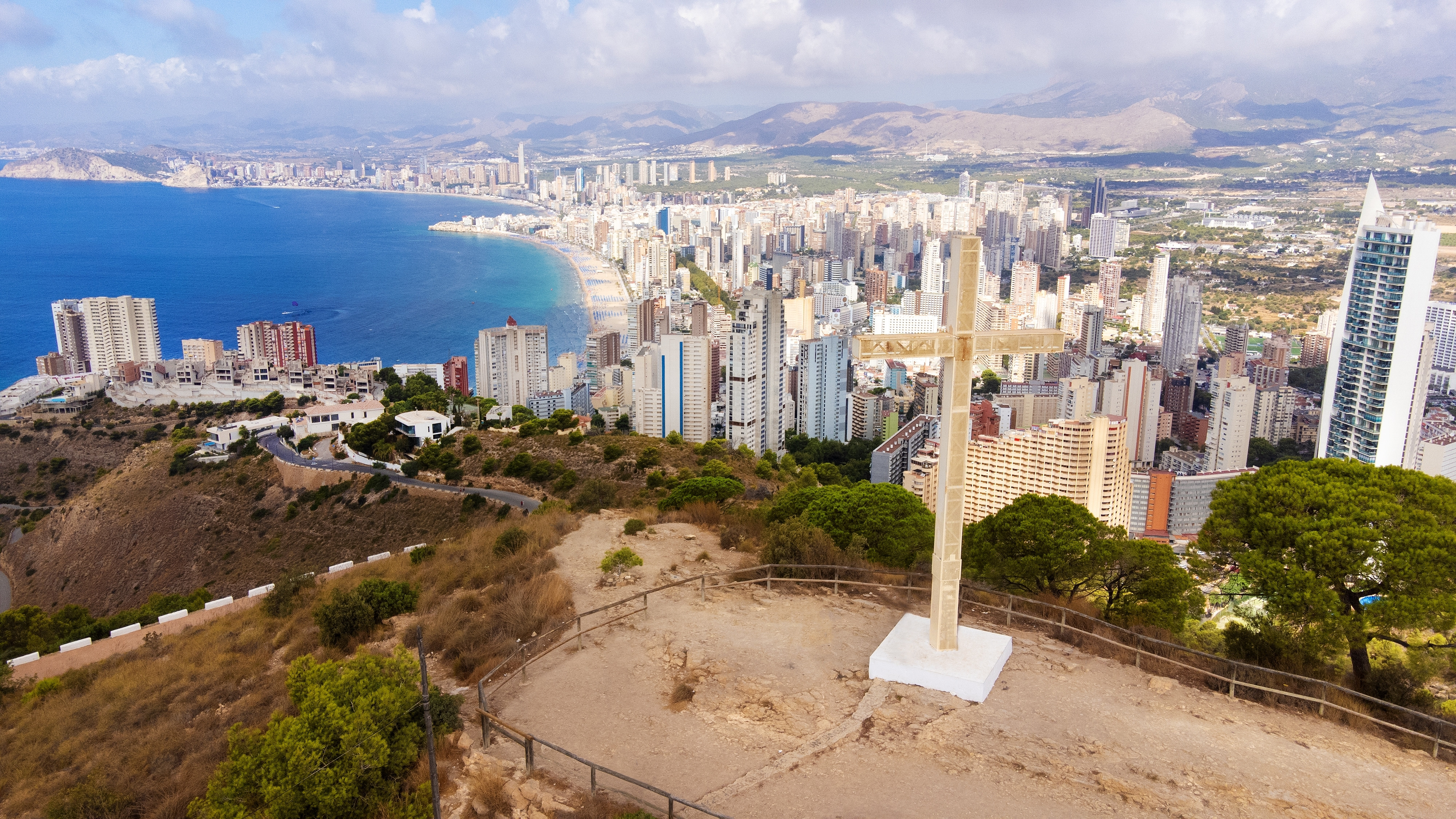 Situată pe vârful masivului Sierra Helada, crucea a fost ridicată în anii ’70, cu scop evanghelic, fiind transportată pe umeri de locuitorii din Benidorm, de la biserica San Jaime până pe vârful muntelui.